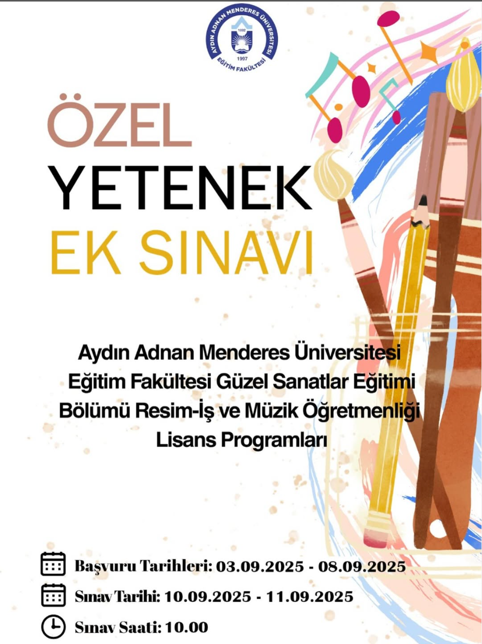 2025-2026 Eğitim-Öğretim Yılı Eğitim Fakültesi Özel Yetenek Ek Sınavı Duyurusu2025-2026 Eğitim-Öğretim Yılı Eğitim Fakültesi Özel Yetenek Sınavı duyurusu ekte ilan edilmiştir.