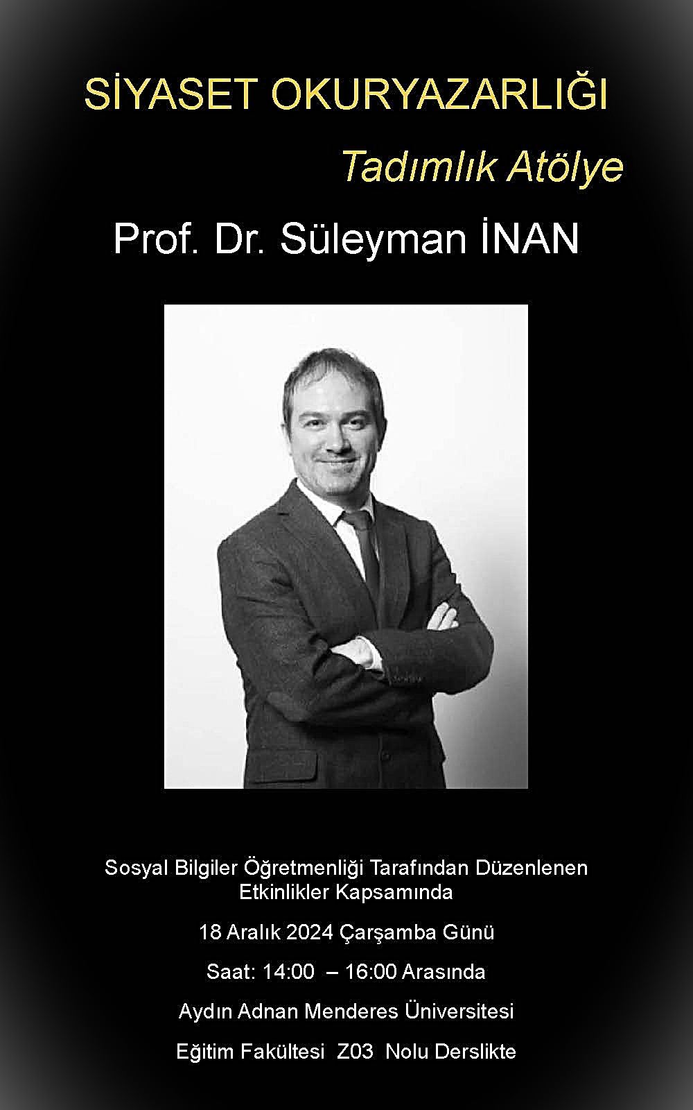 Siyaset Okuryazarlığı AtölyesiFakültemiz Sosyal Bilgiler Öğretmenliği tarafından düzenlenen etkinlikler kapsamında, 18 Aralık 2024 Çarşamba günü saat 14:00-16:00 arasında, Aydın Adnan Menderes Üniversitesi Eğitim Fakültesi Z03 nolu derslikte Pamukkale Üniversitesi Öğretim Üyesi Prof. Dr. Süleyman İnan'ın katılımıyla "Siyaset Okuryazarlığı Atölyesi" düzenlenecektir.