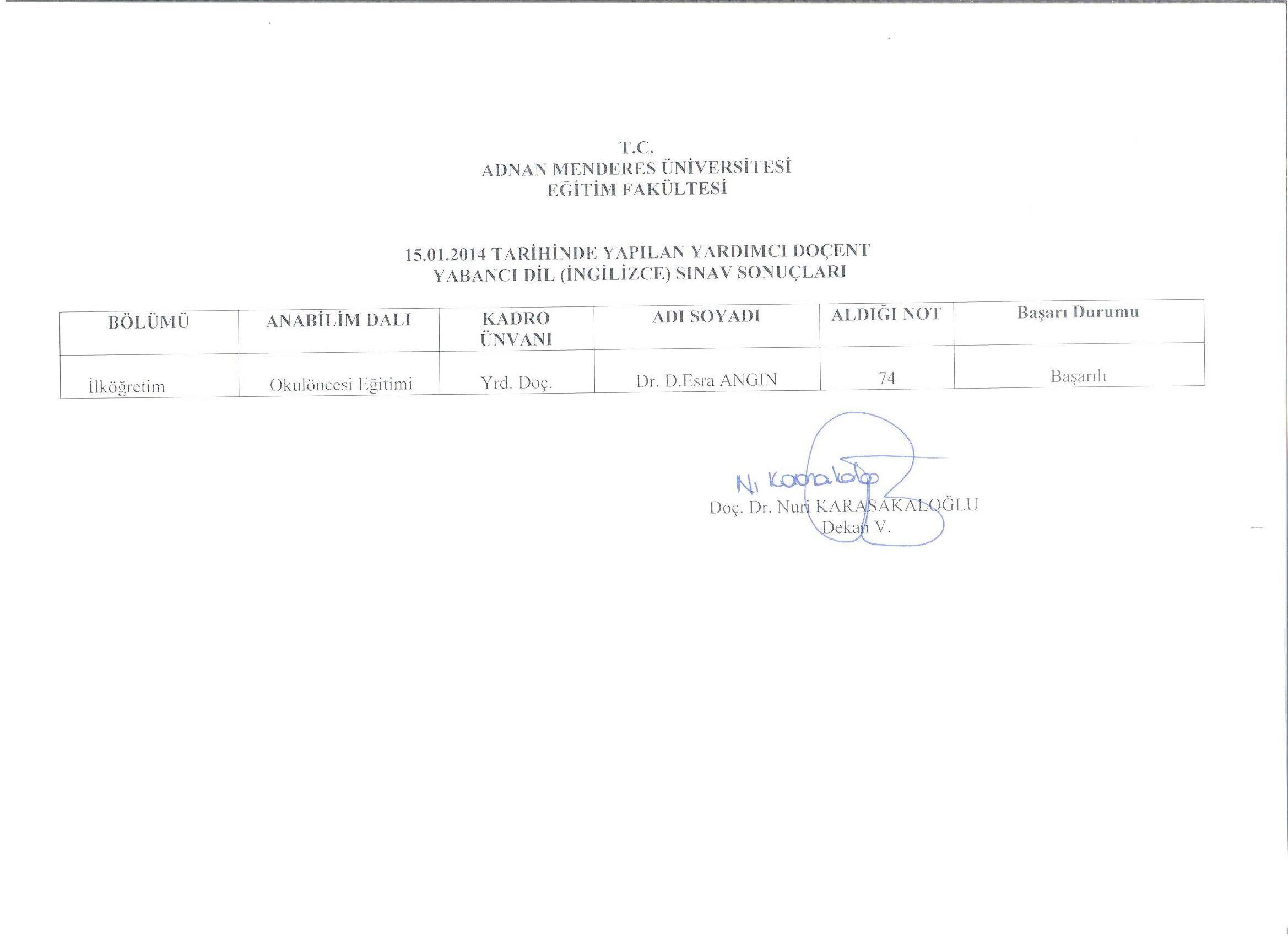 15.01.2014TARİHİNDE YAPILAN YARDIMCI DOÇEN YABANCI DİL SINAVI SONUCU