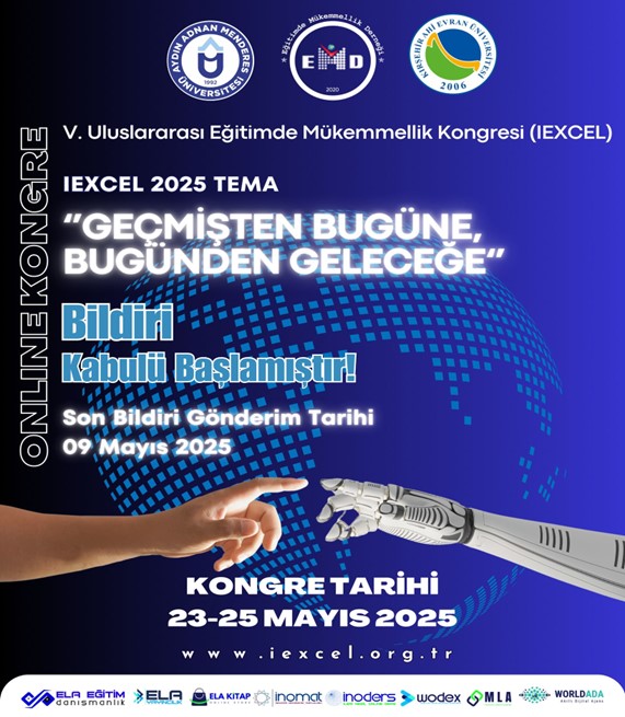 23-25 Mayıs 2025 tarihlerinde, Aydın Adnan Menderes Üniversitesi ve Ahi Evran Üniversitesi iÅŸbirliÄŸiyle çevrimiçi olarak düzenlenecek olan 5. EÄŸitimde Mükemmellik Kongresi'ne iliÅŸkin tüm detaylar, https://iexcel.org.tr/ internet adresinde yayımlanmıştır.