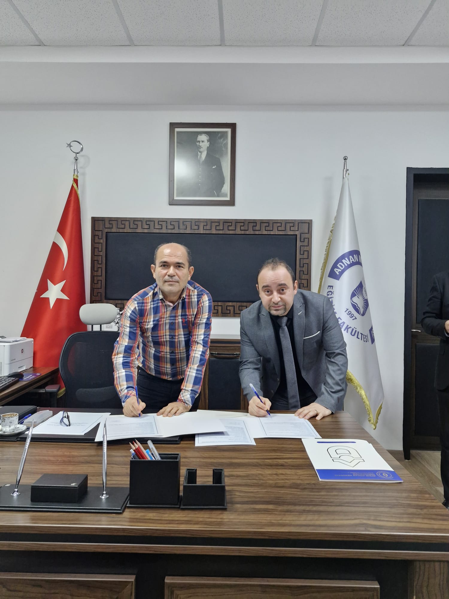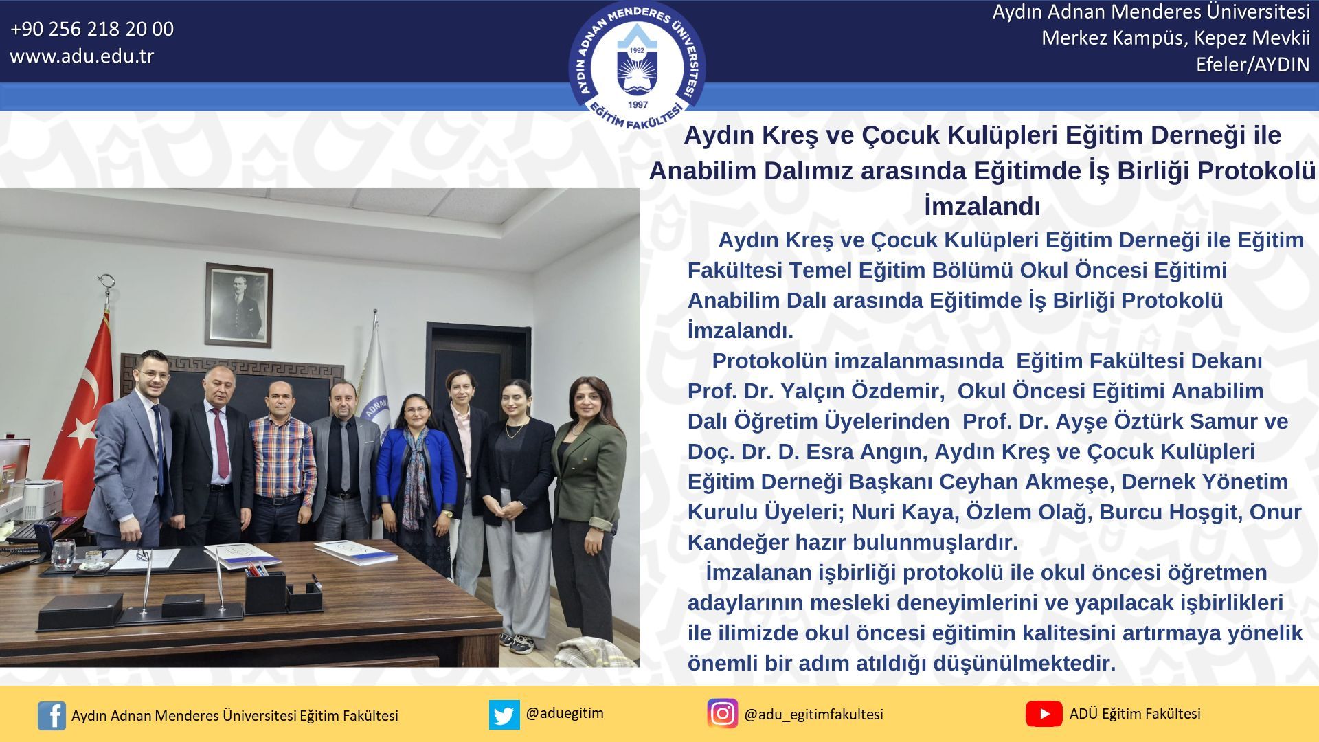 Aydın Kreş ve Çocuk Kulüpleri Eğitim Derneği ile Eğitim Fakültesi Temel Eğitim Bölümü Okul Öncesi Eğitimi Anabilim Dalı arasında Eğitimde İş Birliği Protokolü İmzalandı. Protokolün imzalanmasında Eğitim Fakültesi Dekanı Prof. Dr. Yalçın Özdemir, Okul Öncesi Eğitimi Anabilim Dalı Öğretim Üyelerinden Prof. Dr. Ayşe Öztürk Samur ve Doç. Dr. D. Esra Angın, Aydın Kreş ve Çocuk Kulüpleri Eğitim Derneği Başkanı Ceyhan Akmeşe, Dernek Yönetim Kurulu Üyeleri; Nuri Kaya, Özlem Olağ, Burcu Hoşgit, Onur Kandeğer hazır bulunmuşlardır. İmzalanan işbirliği protokolü ile okul öncesi öğretmen adaylarının mesleki deneyimlerini ve yapılacak işbirlikleri ile ilimizde okul öncesi eğitimin kalitesini artırmaya yönelik önemli bir adım atıldığı düşünülmektedir.