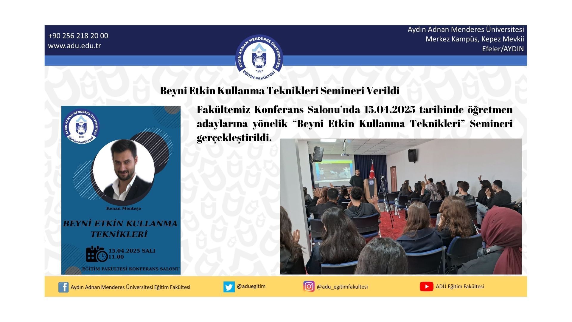 Fakültemiz Konferans Salonu’nda 15.04.2025 tarihinde öÄŸretmen adaylarına yönelik “Beyni Etkin Kullanma Teknikleri” Semineri gerçekleÅŸtirildi.