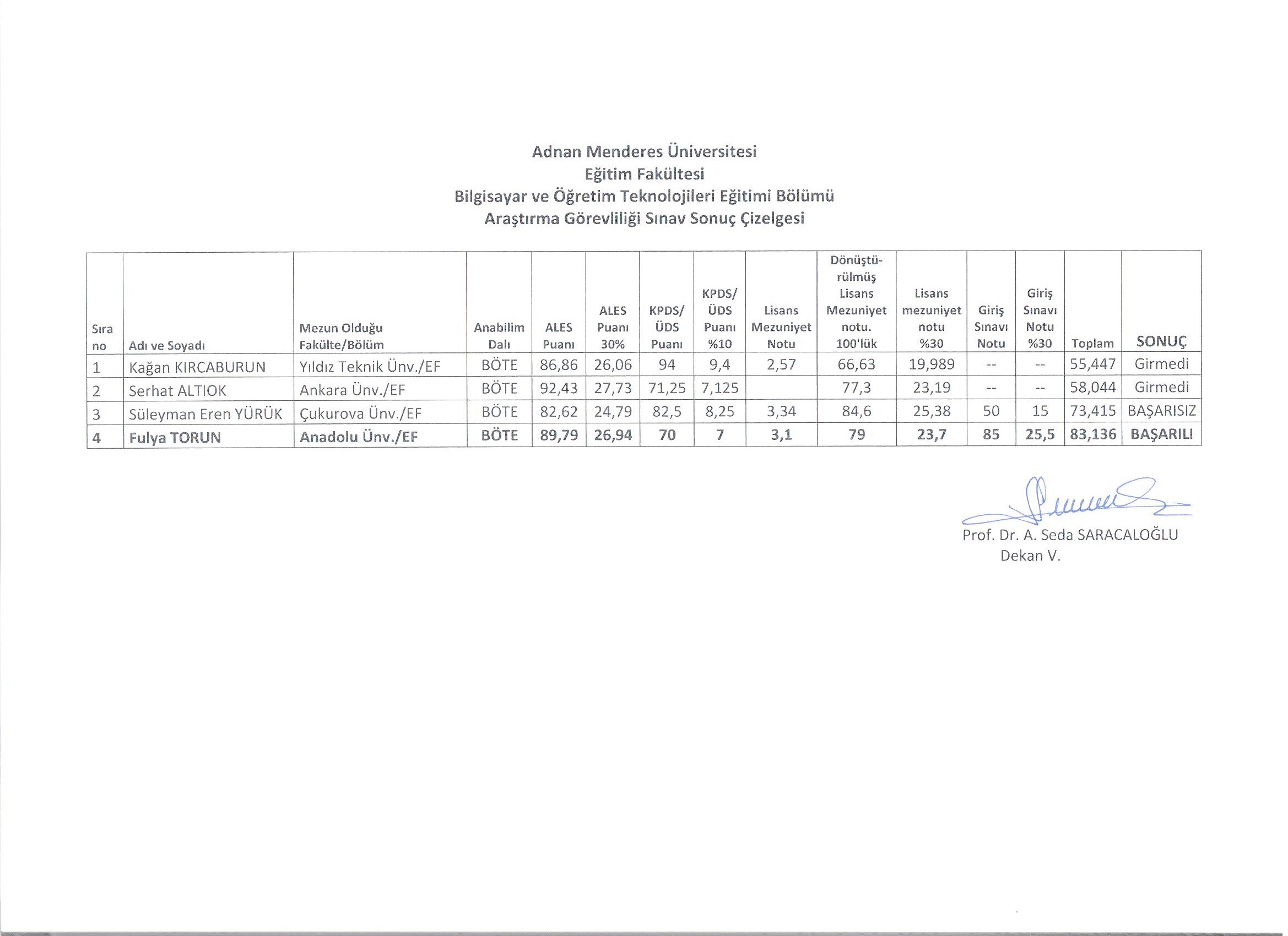 BÖTE BÖLÜMÜ ARAŞTIRMA GÖREVLİLİĞİ GİRİŞ SINAVI SONUCU