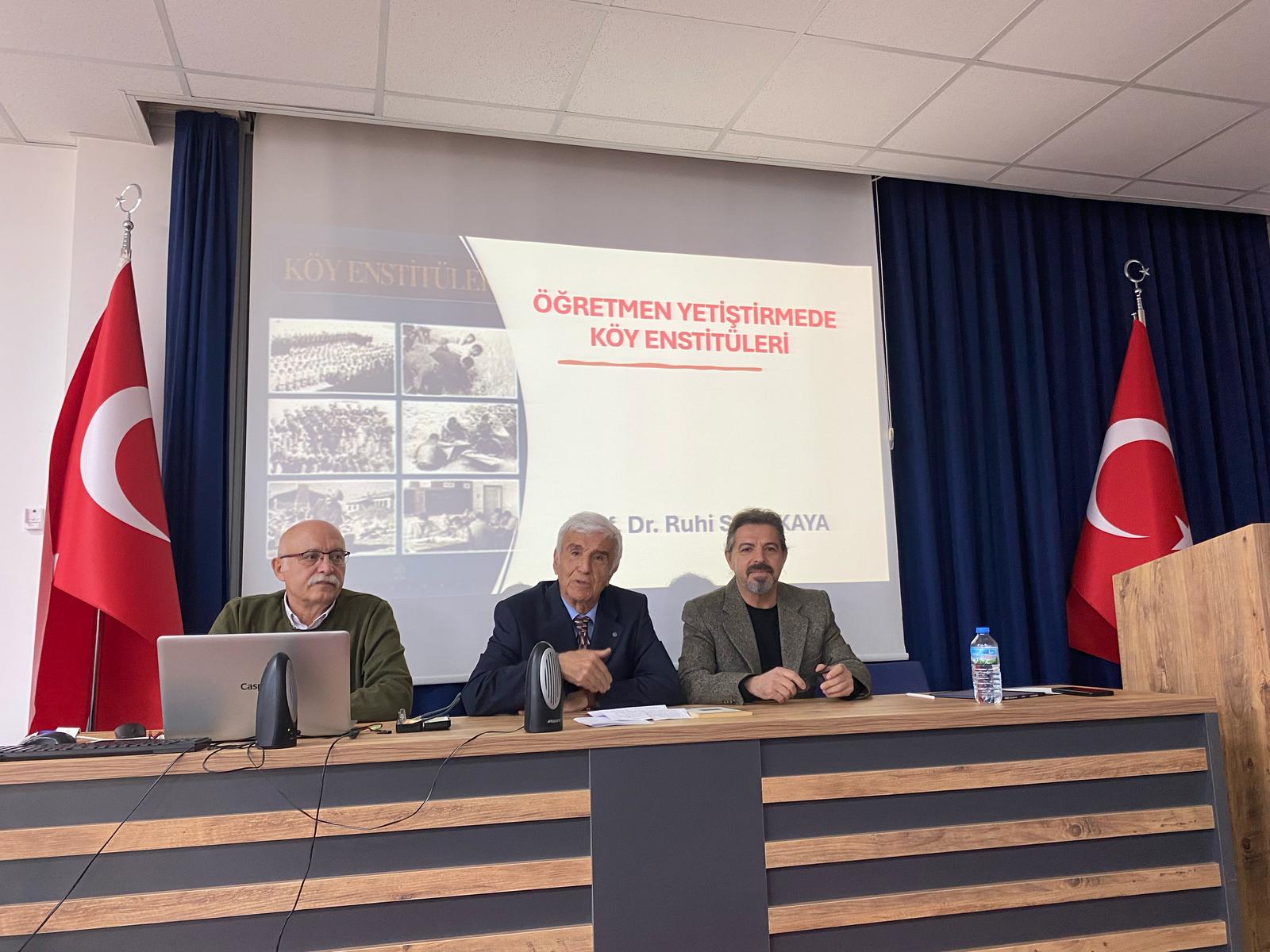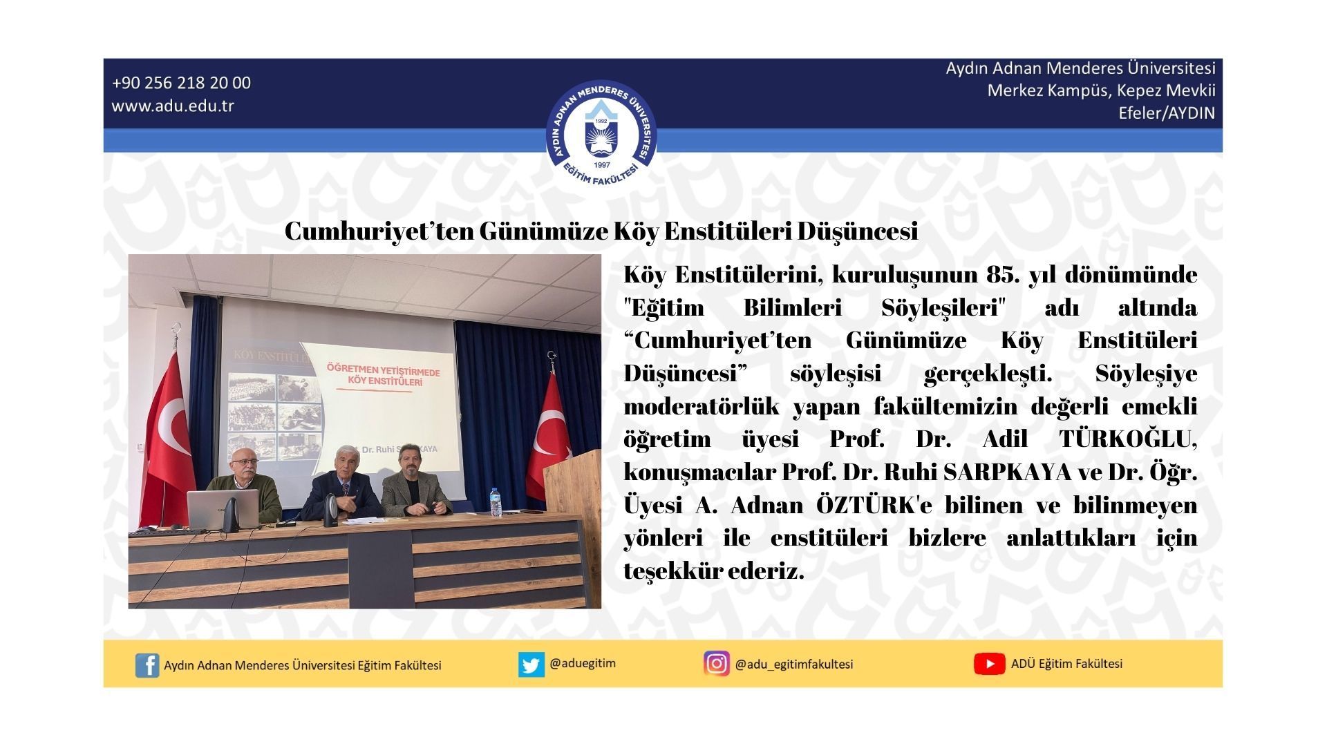 Köy Enstitülerini, kuruluÅŸunun 85. yıl dönümünde "EÄŸitim Bilimleri SöyleÅŸileri" adı altında “Cumhuriyet’ten Günümüze Köy Enstitüleri DüÅŸüncesi” söyleÅŸisi gerçekleÅŸti. SöyleÅŸiye moderatörlük yapan fakültemizin deÄŸerli emekli öÄŸretim üyesi Prof. Dr. Adil TÜRKOÄžLU, konuÅŸmacılar Prof. Dr. Ruhi SARPKAYA ve Dr. ÖÄŸr. Üyesi A. Adnan ÖZTÜRK'e bilinen ve bilinmeyen yönleri ile enstitüleri bizlere anlattıkları için teÅŸekkür ederiz.