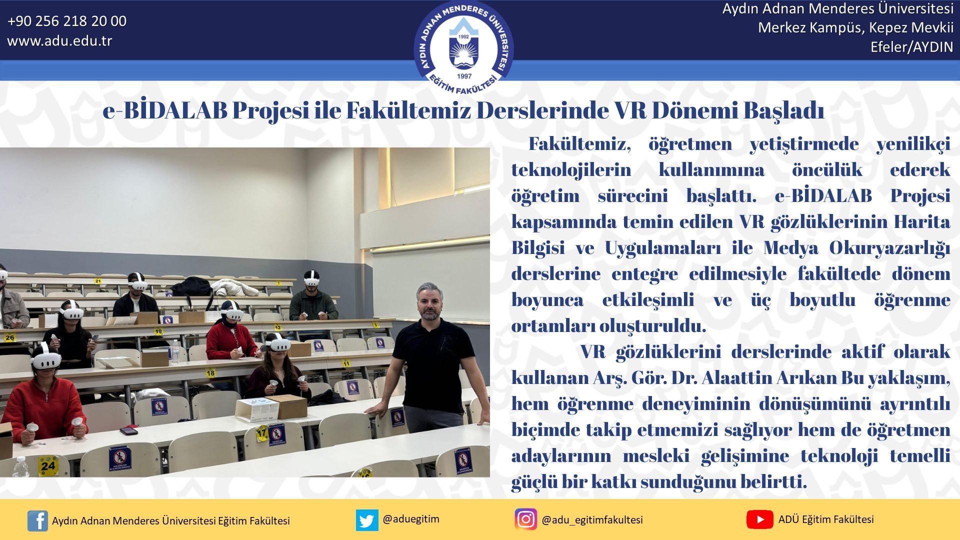 VR gözlüklerini derslerinde aktif olarak kullanan ArÅŸ. Gör. Dr. Alaattin Arıkan Bu yaklaşım, hem öÄŸrenme deneyiminin dönüÅŸümünü ayrıntılı biçimde takip etmemizi saÄŸlıyor hem de öÄŸretmen adaylarının mesleki geliÅŸimine teknoloji temelli güçlü bir katkı sunduÄŸunu belirtti.
