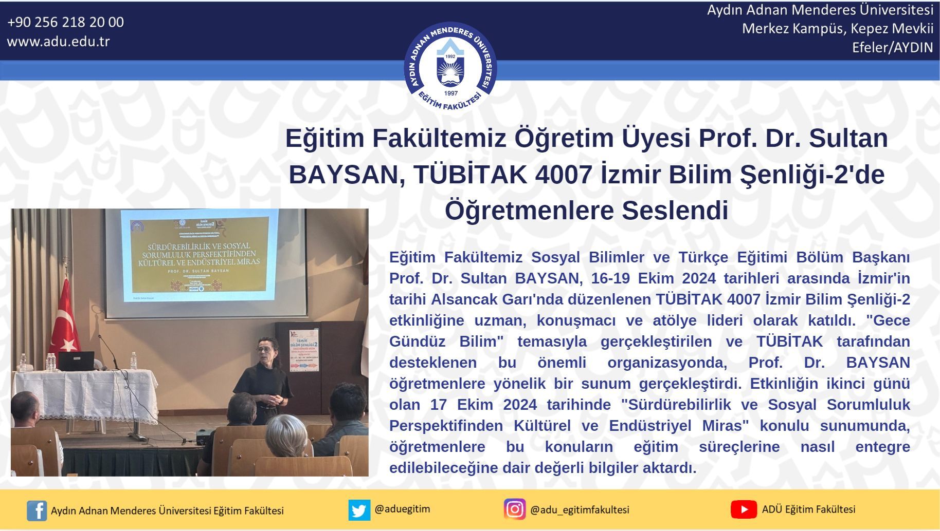 "Gece Gündüz Bilim" temasıyla gerçekleştirilen ve TÜBİTAK tarafından desteklenen bu önemli organizasyonda, Prof. Dr. BAYSAN öğretmenlere yönelik bir sunum gerçekleştirdi. Etkinliğin ikinci günü olan 17 Ekim 2024 tarihinde "Sürdürebilirlik ve Sosyal Sorumluluk Perspektifinden Kültürel ve Endüstriyel Miras" konulu sunumunda, öğretmenlere bu konuların eğitim süreçlerine nasıl entegre edilebileceğine dair değerli bilgiler aktardı.