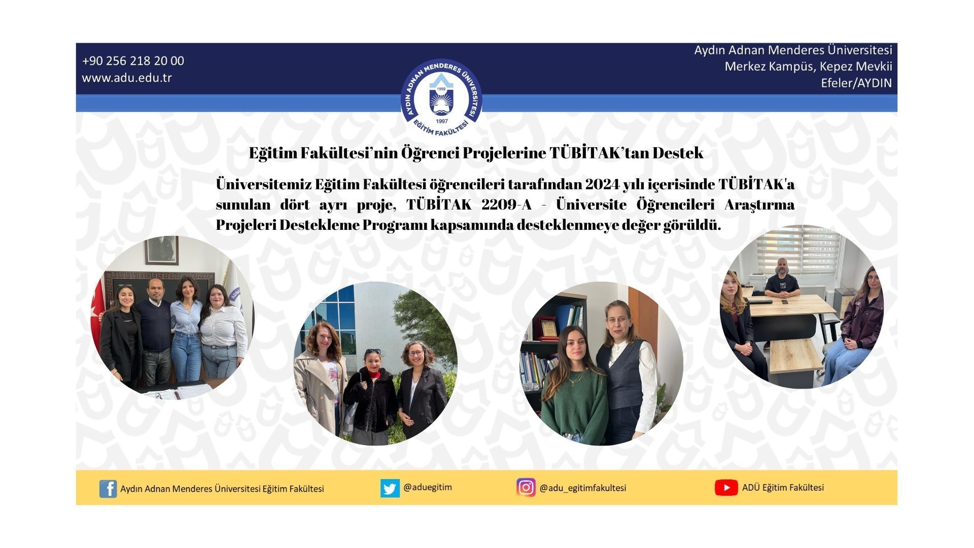 Üniversitemiz Eğitim Fakültesi öğrencileri tarafından 2024 yılı içerisinde TÜBİTAK'a sunulan dört ayrı proje, TÜBİTAK 2209-A - Üniversite Öğrencileri Araştırma Projeleri Destekleme Programı kapsamında desteklenmeye değer görüldü.