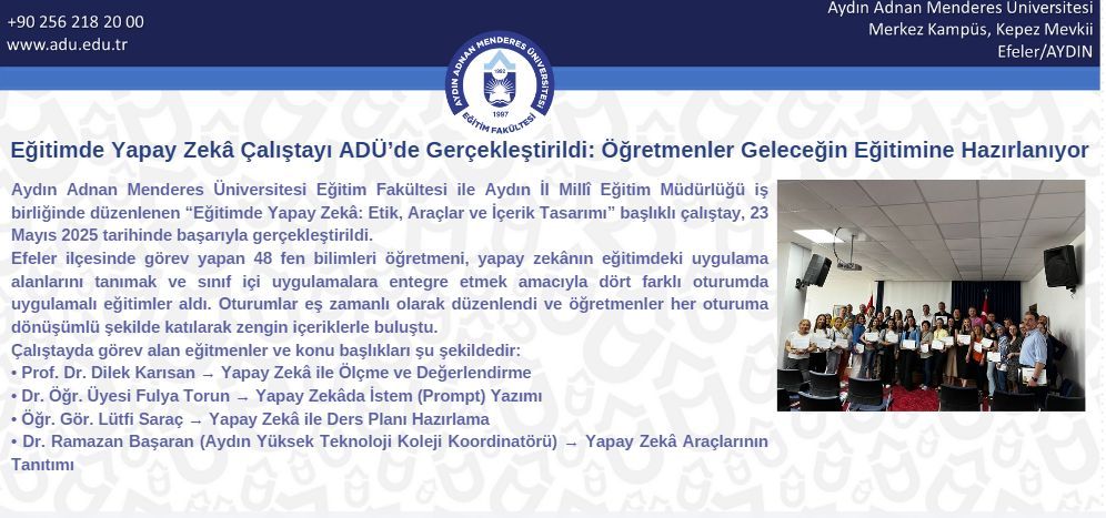 Aydın Adnan Menderes Üniversitesi Eğitim Fakültesi ile Aydın İl Millî Eğitim Müdürlüğü iş birliğinde düzenlenen “Eğitimde Yapay Zekâ: Etik, Araçlar ve İçerik Tasarımı” başlıklı çalıştay, 23 Mayıs 2025 tarihinde başarıyla gerçekleştirildi.