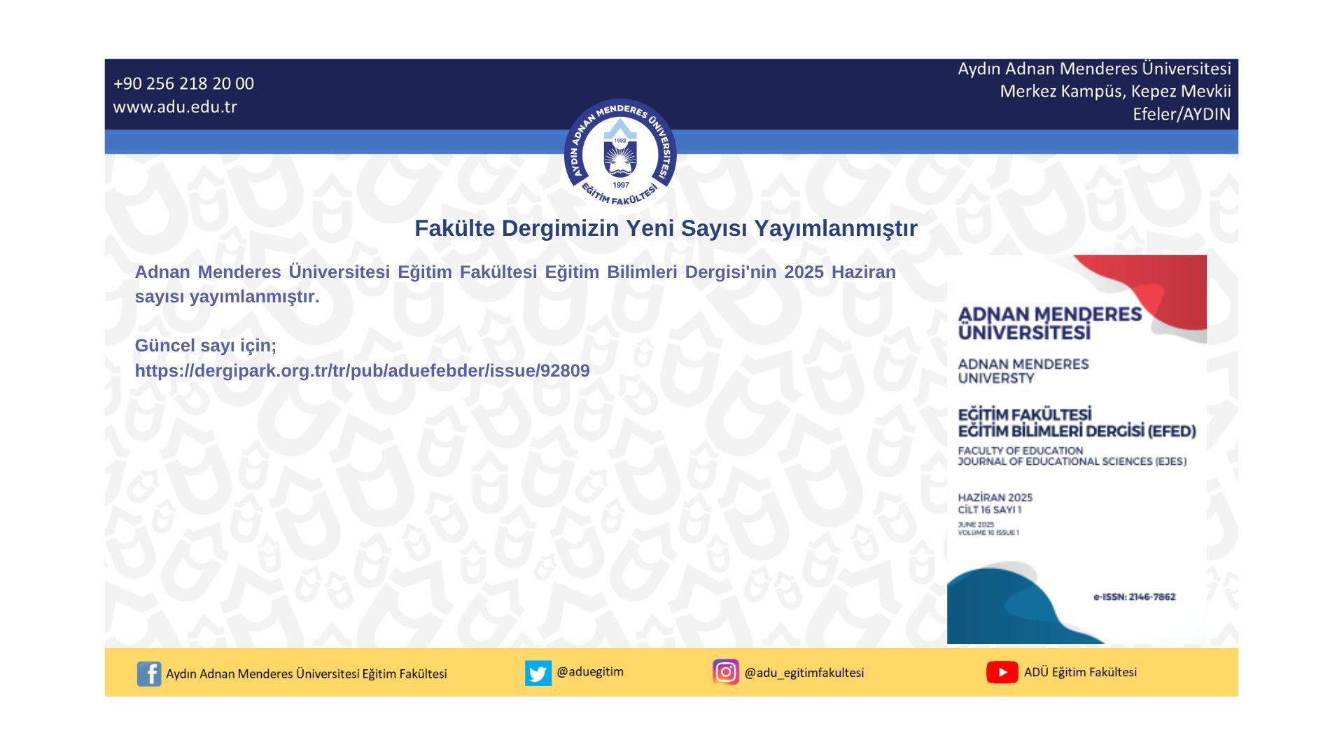 Adnan Menderes Üniversitesi EÄŸitim Fakültesi EÄŸitim Bilimleri Dergisi'nin 2025 Haziran sayısı yayımlanmıştır.