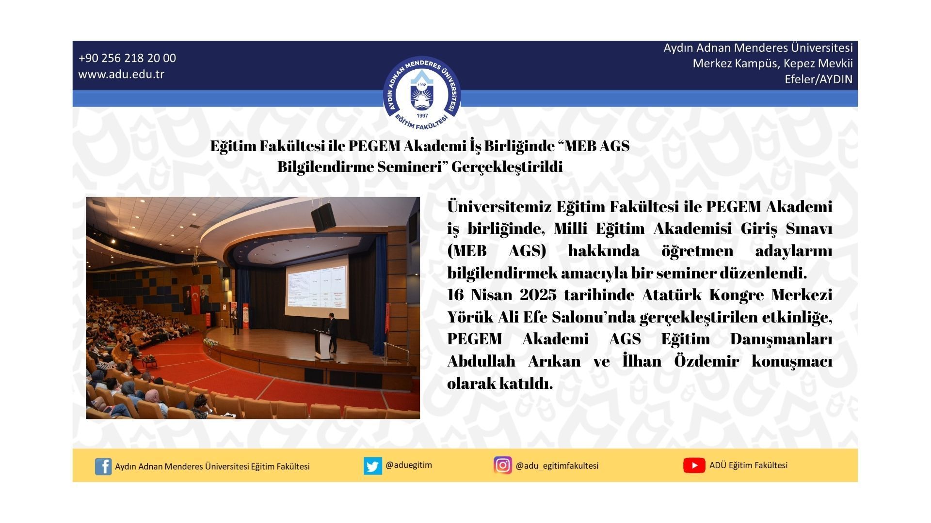 Üniversitemiz Eğitim Fakültesi ile PEGEM Akademi iş birliğinde, Milli Eğitim Akademisi Giriş Sınavı (MEB AGS) hakkında öğretmen adaylarını bilgilendirmek amacıyla bir seminer düzenlendi.