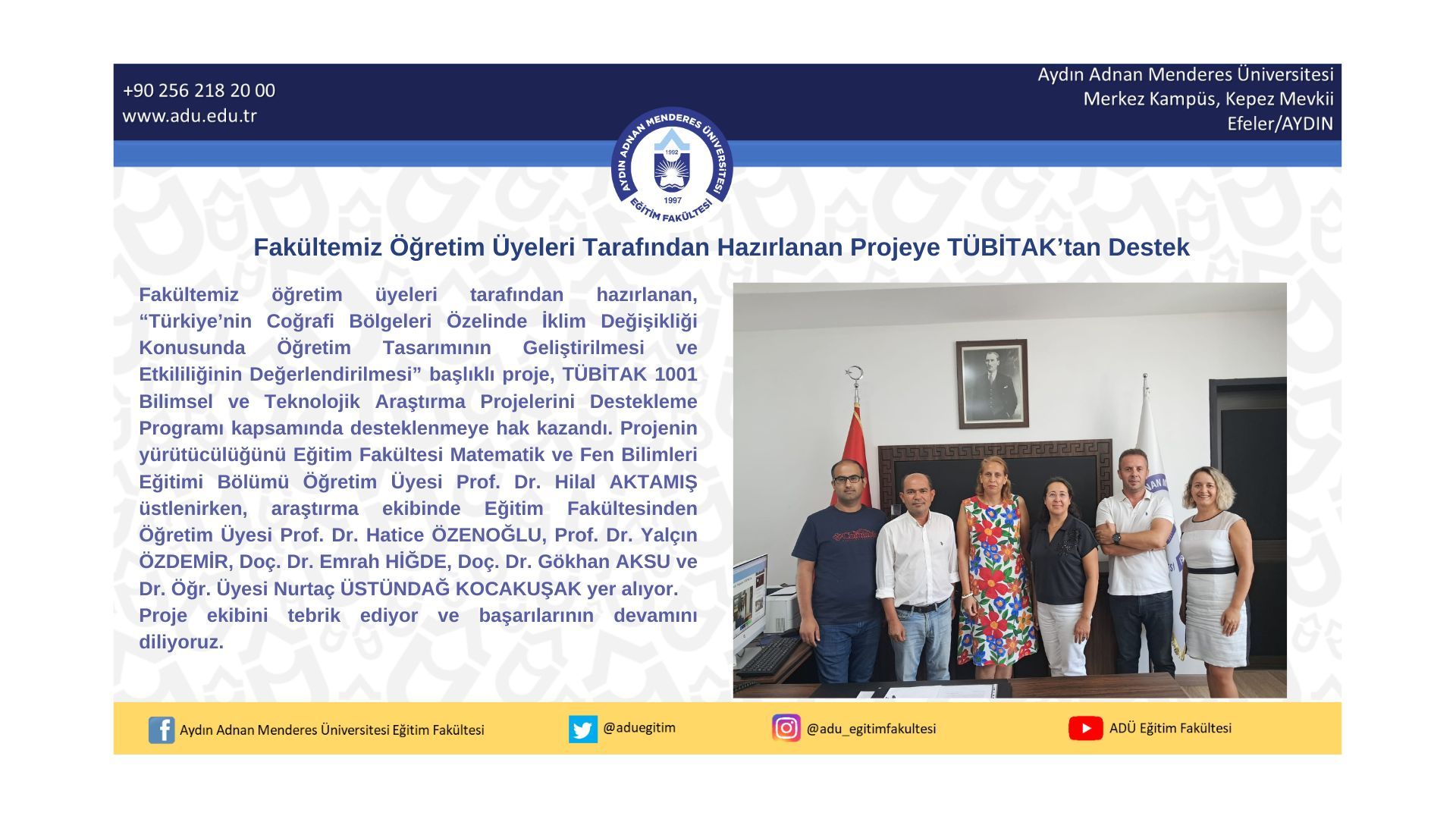 Fakültemiz öğretim üyeleri tarafından hazırlanan, “Türkiye’nin Coğrafi Bölgeleri Özelinde İklim Değişikliği Konusunda Öğretim Tasarımının Geliştirilmesi ve Etkililiğinin Değerlendirilmesi” başlıklı proje, TÜBİTAK 1001 Bilimsel ve Teknolojik Araştırma Projelerini Destekleme Programı kapsamında desteklenmeye hak kazandı. Projenin yürütücülüğünü Eğitim Fakültesi Matematik ve Fen Bilimleri Eğitimi Bölümü Öğretim Üyesi Prof. Dr. Hilal AKTAMIŞ üstlenirken, araştırma ekibinde Eğitim Fakültesinden Öğretim Üyesi Prof. Dr. Hatice ÖZENOĞLU, Prof. Dr. Yalçın ÖZDEMİR, Doç. Dr. Emrah HİĞDE, Doç. Dr. Gökhan AKSU ve Dr. Öğr. Üyesi Nurtaç ÜSTÜNDAĞ KOCAKUŞAK yer alıyor.