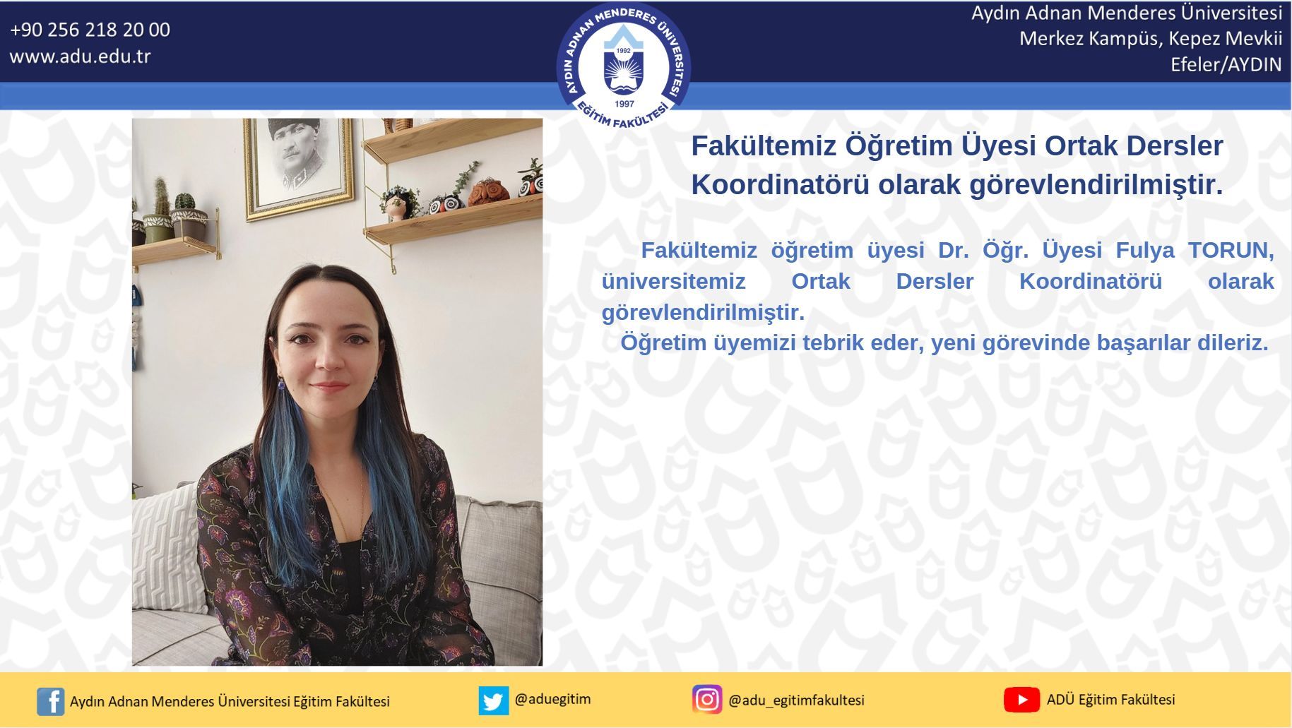 Fakültemiz öÄŸretim üyesi Dr. ÖÄŸr. Üyesi Fulya TORUN, üniversitemiz Ortak Dersler Koordinatörü olarak görevlendirilmiÅŸtir.
