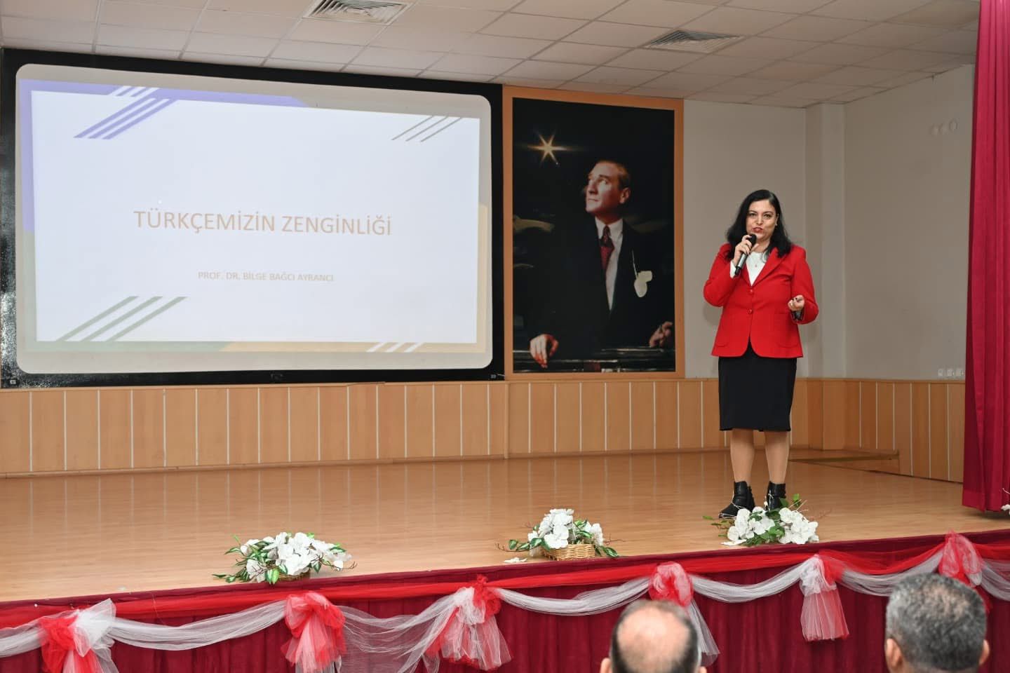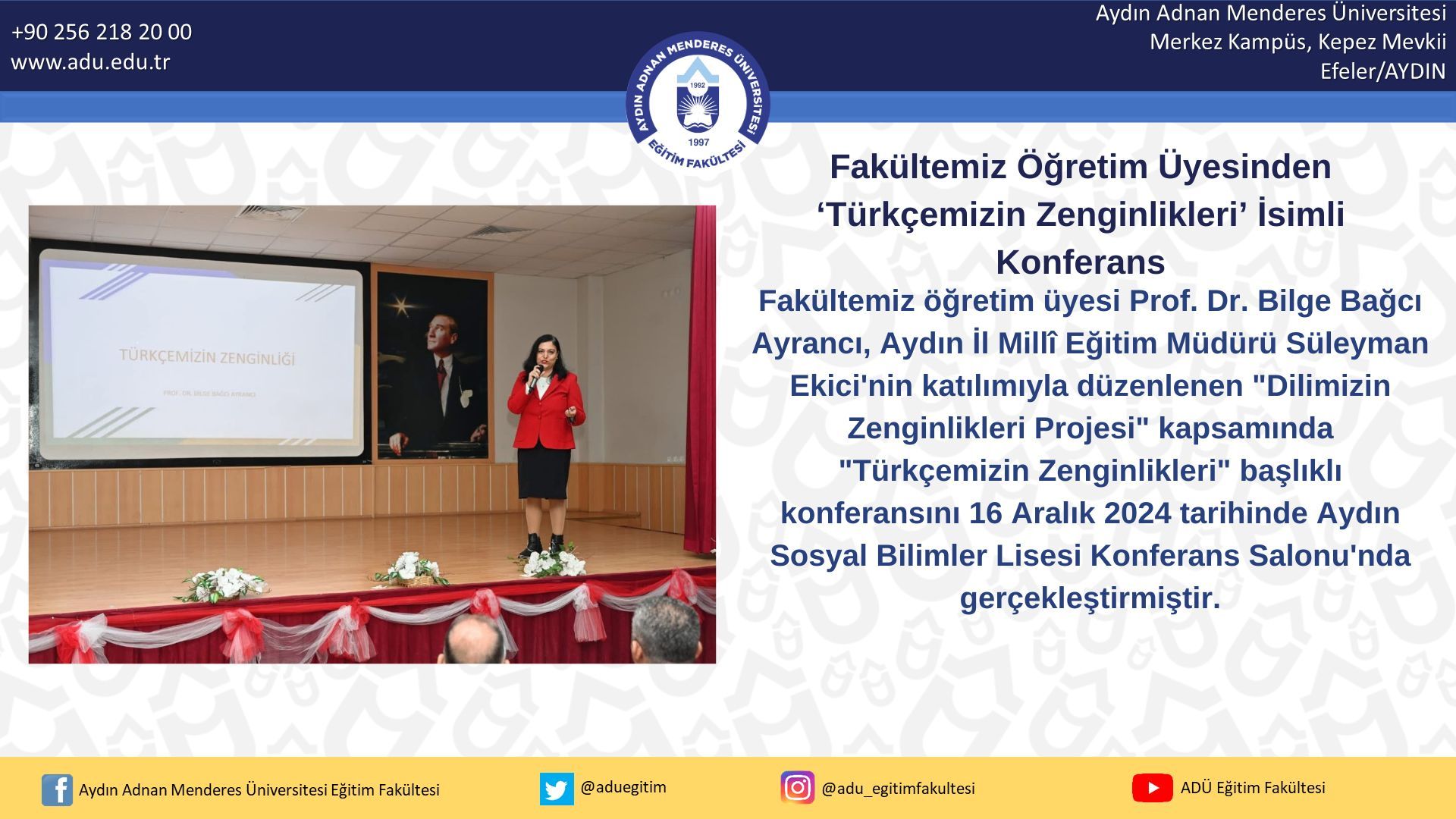 Fakültemiz öğretim üyesi Prof. Dr. Bilge Bağcı Ayrancı, Aydın İl Millî Eğitim Müdürü Süleyman Ekici'nin katılımıyla düzenlenen "Dilimizin Zenginlikleri Projesi" kapsamında "Türkçemizin Zenginlikleri" başlıklı konferansını 16 Aralık 2024 tarihinde Aydın Sosyal Bilimler Lisesi Konferans Salonu'nda gerçekleştirmiştir.
