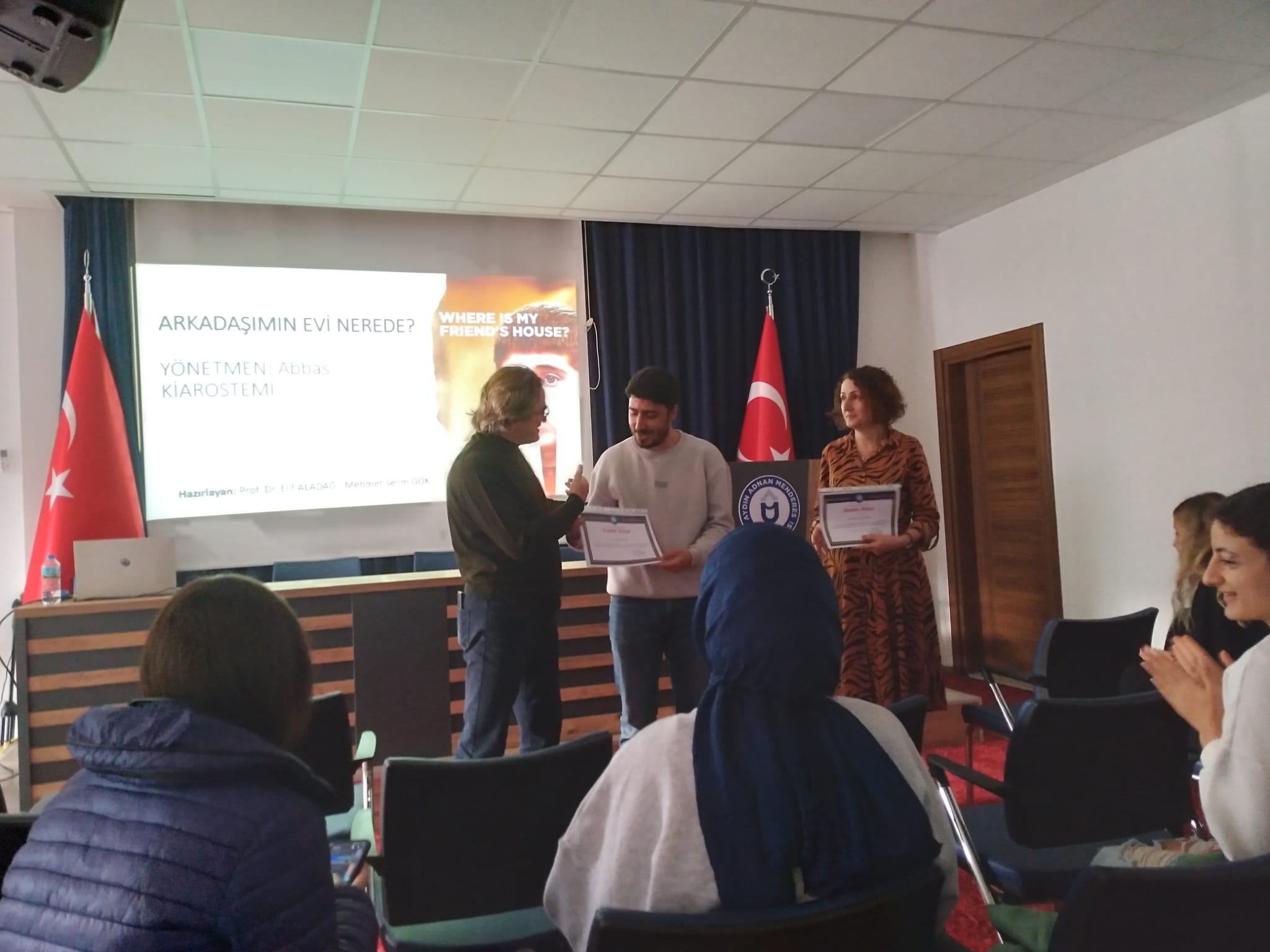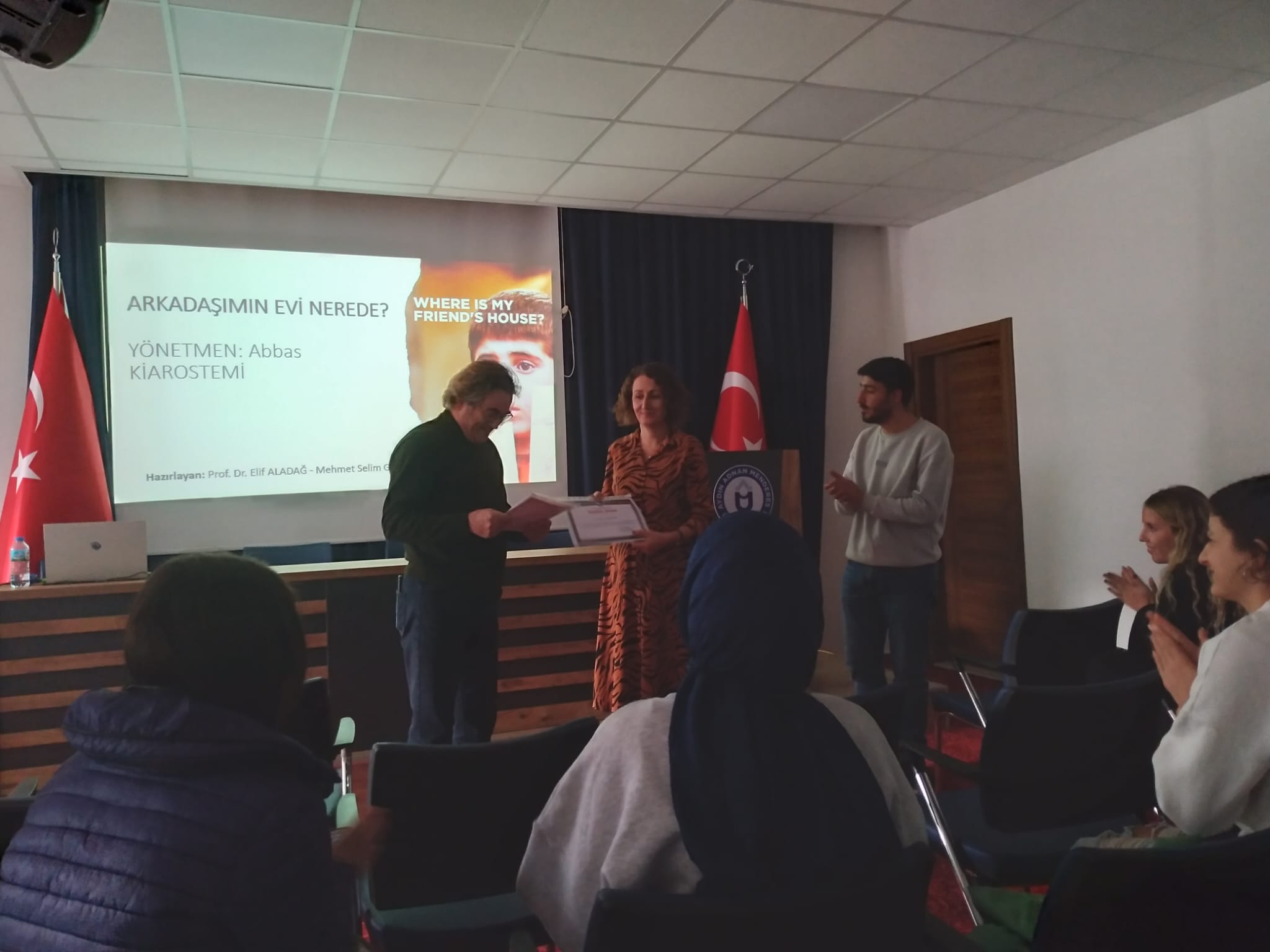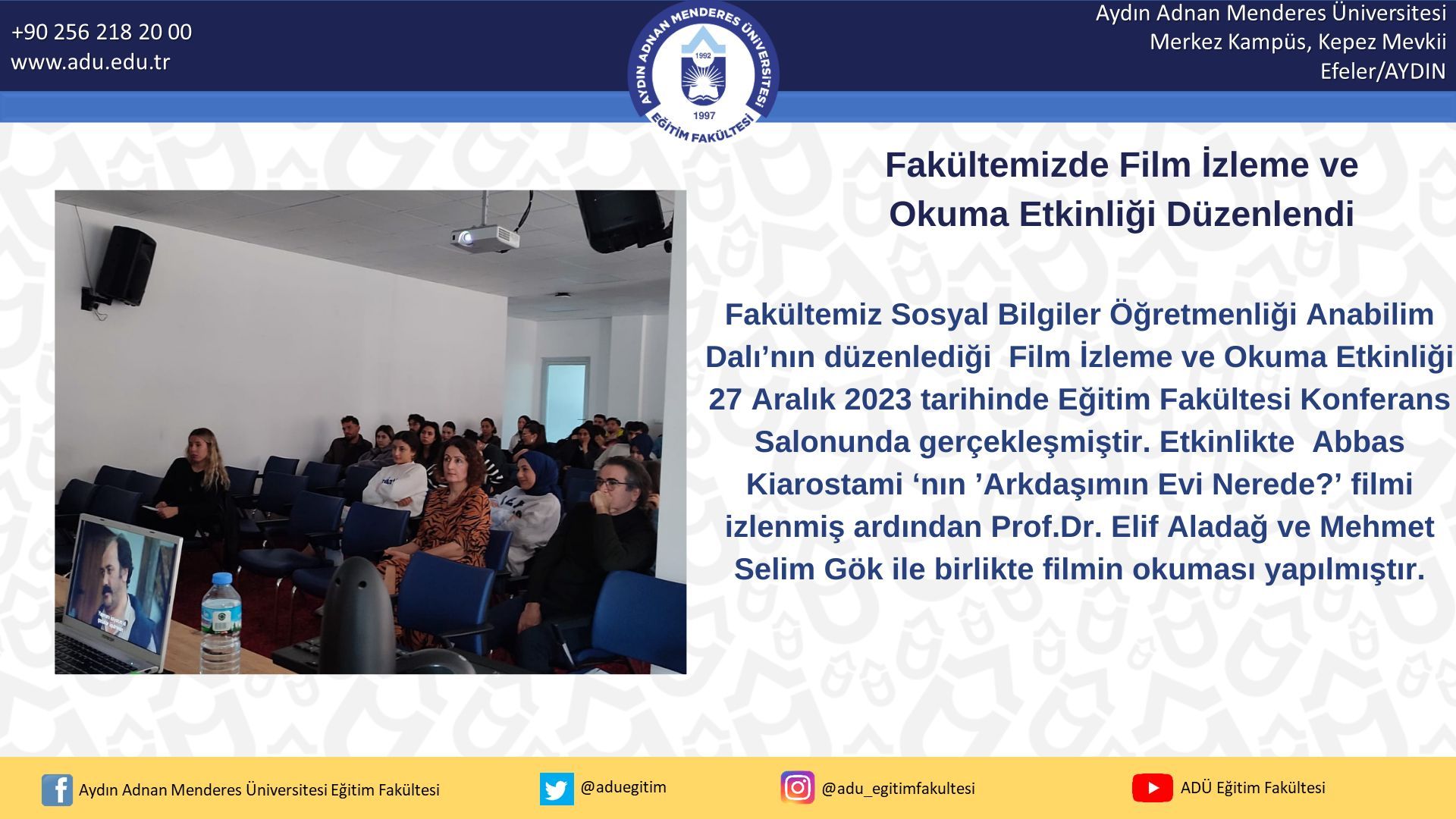 Fakültemiz Sosyal Bilgiler ÖÄŸretmenliÄŸi Anabilim Dalı’nın düzenlediÄŸi Film İzleme ve Okuma EtkinliÄŸi 27 Aralık 2023 tarihinde EÄŸitim Fakültesi Konferans Salonunda gerçekleÅŸmiÅŸtir. Etkinlikte Abbas Kiarostami ‘nın ’Arkdaşımın Evi Nerede?’ filmi izlenmiÅŸ ardından Prof.Dr. Elif AladaÄŸ ve Mehmet Selim Gök ile birlikte filmin okuması yapılmıştır.