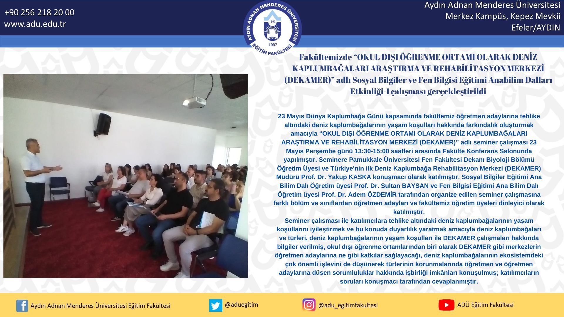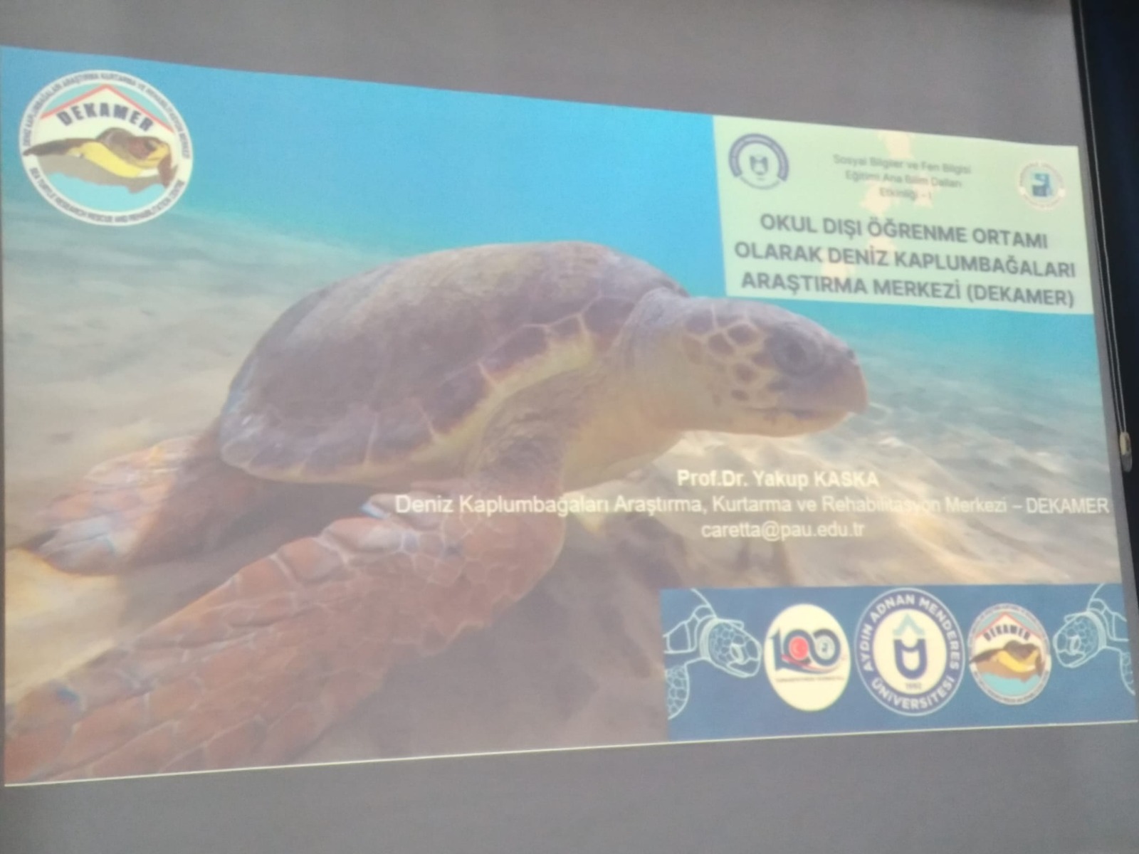 23 Mayıs Dünya Kaplumbağa Günü kapsamında fakültemiz öğretmen adaylarına tehlike altındaki deniz kaplumbağalarının yaşam koşulları hakkında farkındalık oluşturmak amacıyla “OKUL DIŞI ÖĞRENME ORTAMI OLARAK DENİZ KAPLUMBAĞALARI ARAŞTIRMA VE REHABİLİTASYON MERKEZİ (DEKAMER)” adlı seminer çalışması 23 Mayıs Perşembe günü 13:30-15:00 saatleri arasında Fakülte Konferans Salonunda yapılmıştır. Seminere Pamukkale Üniversitesi Fen Fakültesi Dekanı Biyoloji Bölümü Öğretim Üyesi ve Türkiye'nin ilk Deniz Kaplumbağa Rehabilitasyon Merkezi (DEKAMER) Müdürü Prof. Dr. Yakup KASKA konuşmacı olarak katılmıştır. Sosyal Bilgiler Eğitimi Ana Bilim Dalı Öğretim üyesi Prof. Dr. Sultan BAYSAN ve Fen Bilgisi Eğitimi Ana Bilim Dalı Öğretim üyesi Prof. Dr. Adem ÖZDEMİR tarafından organize edilen seminer çalışmasına farklı bölüm ve sınıflardan öğretmen adayları ve fakültemiz öğretim üyeleri dinleyici olarak katılmıştır. Seminer çalışması ile katılımcılara tehlike altındaki deniz kaplumbağalarının yaşam koşullarını iyileştirmek ve bu konuda duyarlılık yaratmak amacıyla deniz kaplumbağaları ve türleri, deniz kaplumbağalarının yaşam koşulları ile DEKAMER çalışmaları hakkında bilgiler verilmiş, okul dışı öğrenme ortamlarından biri olarak DEKAMER gibi merkezlerin öğretmen adaylarına ne gibi katkılar sağlayacağı, deniz kaplumbağalarının ekosistemdeki çok önemli işlevini de düşünerek türlerinin korunmalarında öğretmen ve öğretmen adaylarına düşen sorumluluklar hakkında işbirliği imkânları konuşulmuş; katılımcıların soruları konuşmacı tarafından cevaplanmıştır.