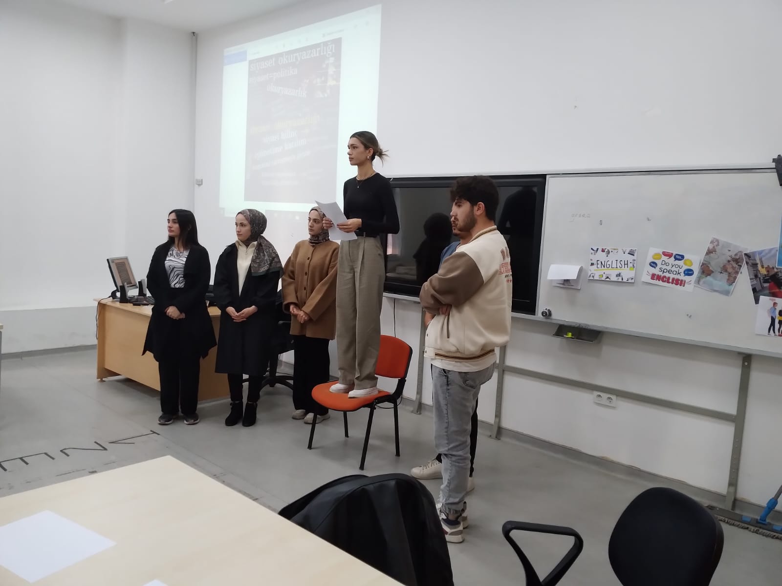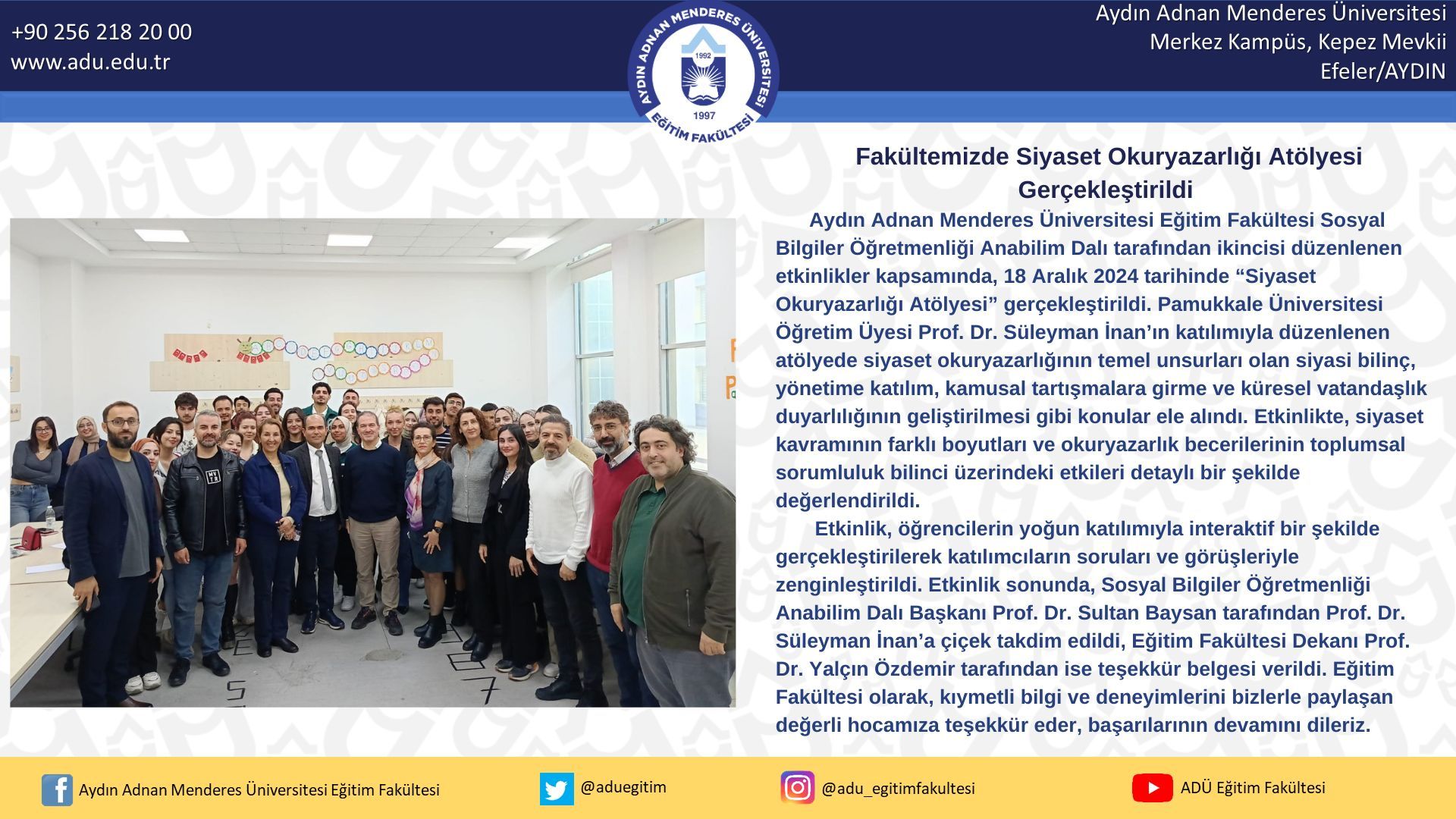 Aydın Adnan Menderes Üniversitesi EÄŸitim Fakültesi Sosyal Bilgiler ÖÄŸretmenliÄŸi Anabilim Dalı tarafından ikincisi düzenlenen etkinlikler kapsamında, 18 Aralık 2024 tarihinde “Siyaset Okuryazarlığı Atölyesi” gerçekleÅŸtirildi. Pamukkale Üniversitesi ÖÄŸretim Üyesi Prof. Dr. Süleyman İnan’ın katılımıyla düzenlenen atölyede siyaset okuryazarlığının temel unsurları olan siyasi bilinç, yönetime katılım, kamusal tartışmalara girme ve küresel vatandaÅŸlık duyarlılığının geliÅŸtirilmesi gibi konular ele alındı.