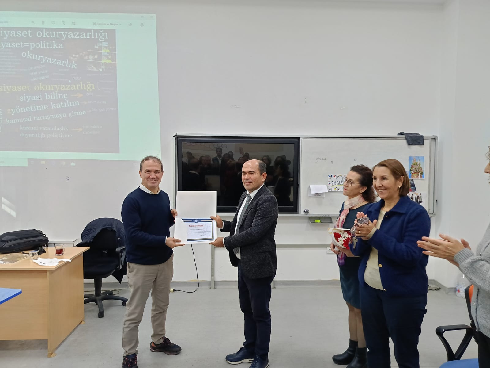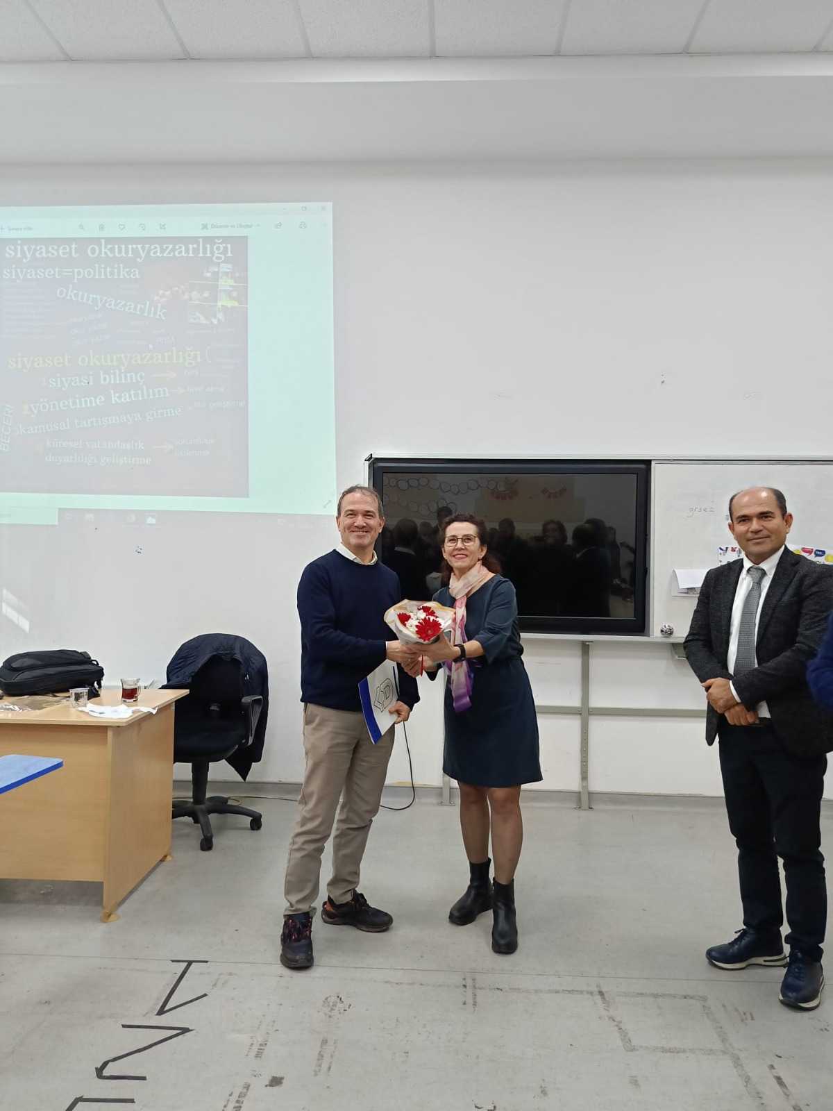 Etkinlikte, siyaset kavramının farklı boyutları ve okuryazarlık becerilerinin toplumsal sorumluluk bilinci üzerindeki etkileri detaylı bir ÅŸekilde deÄŸerlendirildi. Etkinlik, öÄŸrencilerin yoÄŸun katılımıyla interaktif bir ÅŸekilde gerçekleÅŸtirilerek katılımcıların soruları ve görüÅŸleriyle zenginleÅŸtirildi. Etkinlik sonunda, Sosyal Bilgiler ÖÄŸretmenliÄŸi Anabilim Dalı BaÅŸkanı Prof. Dr. Sultan Baysan tarafından Prof. Dr. Süleyman İnan’a çiçek takdim edildi, EÄŸitim Fakültesi Dekanı Prof. Dr. Yalçın Özdemir tarafından ise teÅŸekkür belgesi verildi. EÄŸitim Fakültesi olarak, kıymetli bilgi ve deneyimlerini bizlerle paylaÅŸan deÄŸerli hocamıza teÅŸekkür eder, baÅŸarılarının devamını dileriz.