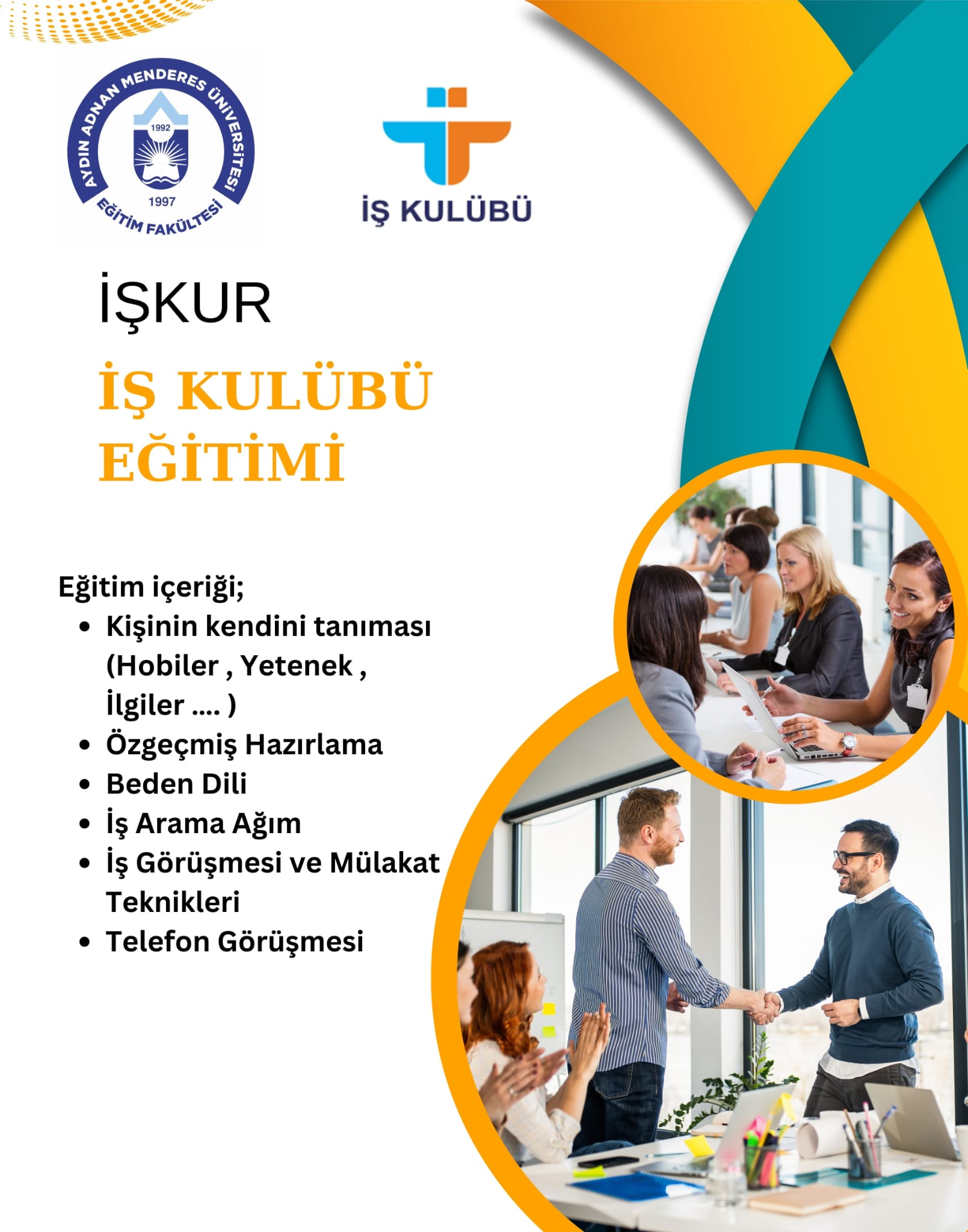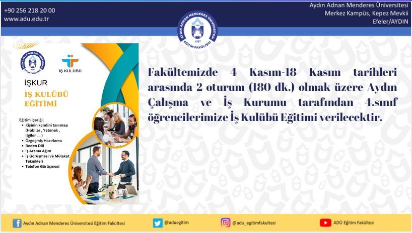 Fakültemizde 4 Kasım-18 Kasım tarihleri arasında 2 oturum (180 dk.) olmak üzere Aydın Çalışma ve İş Kurumu tarafından 4. sınıf öÄŸrencilerimize İş Kulübü EÄŸitimi verilecektir. EÄŸitime katılmak isteyen son sınıf öÄŸrencilerimiz akademik danışmanlarıyla iletiÅŸim kurabilirler.