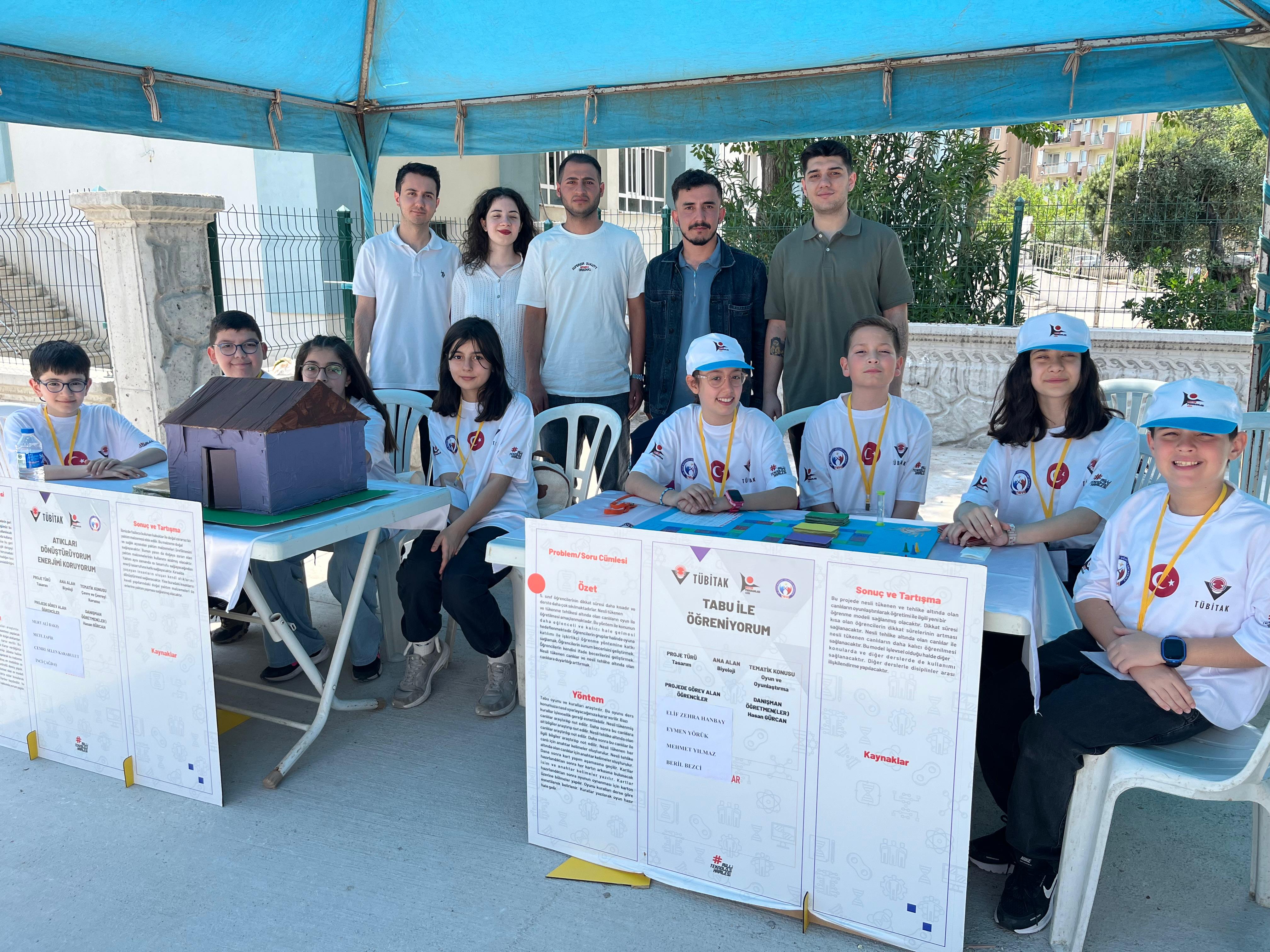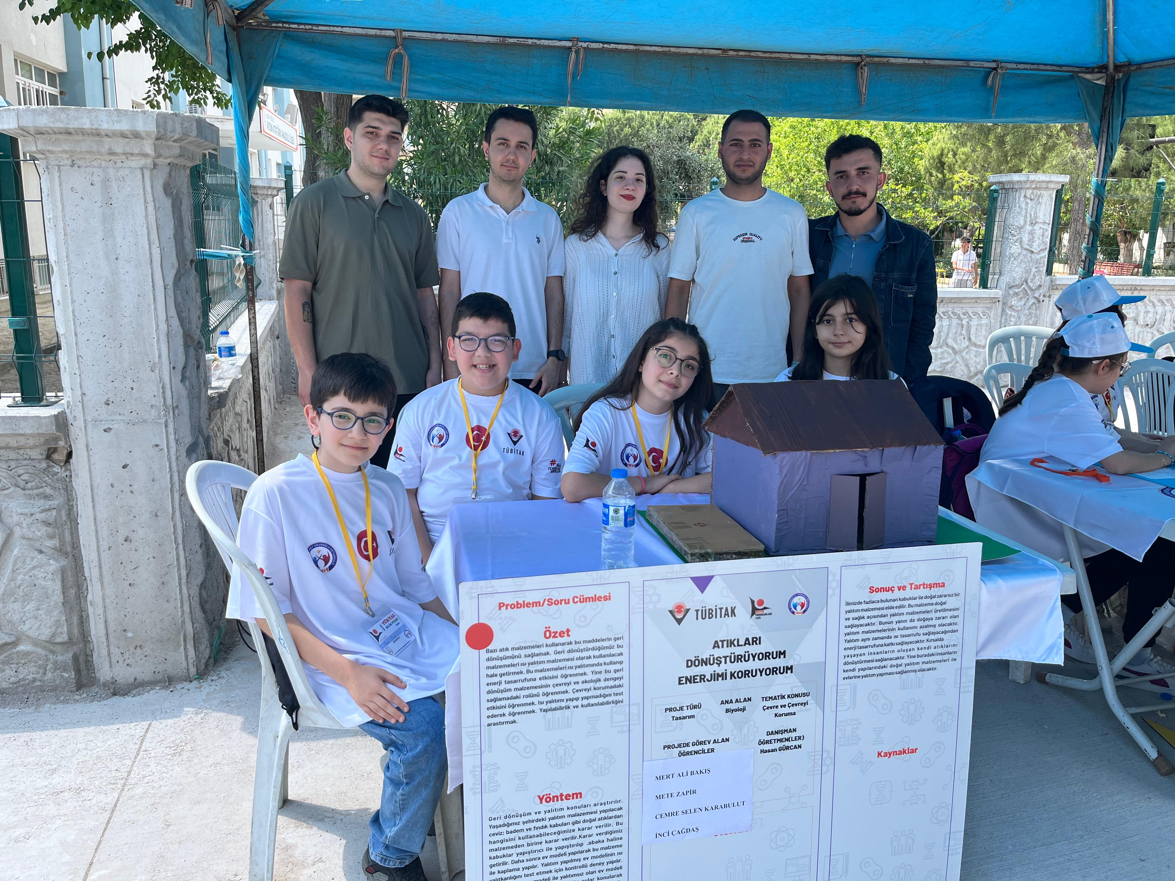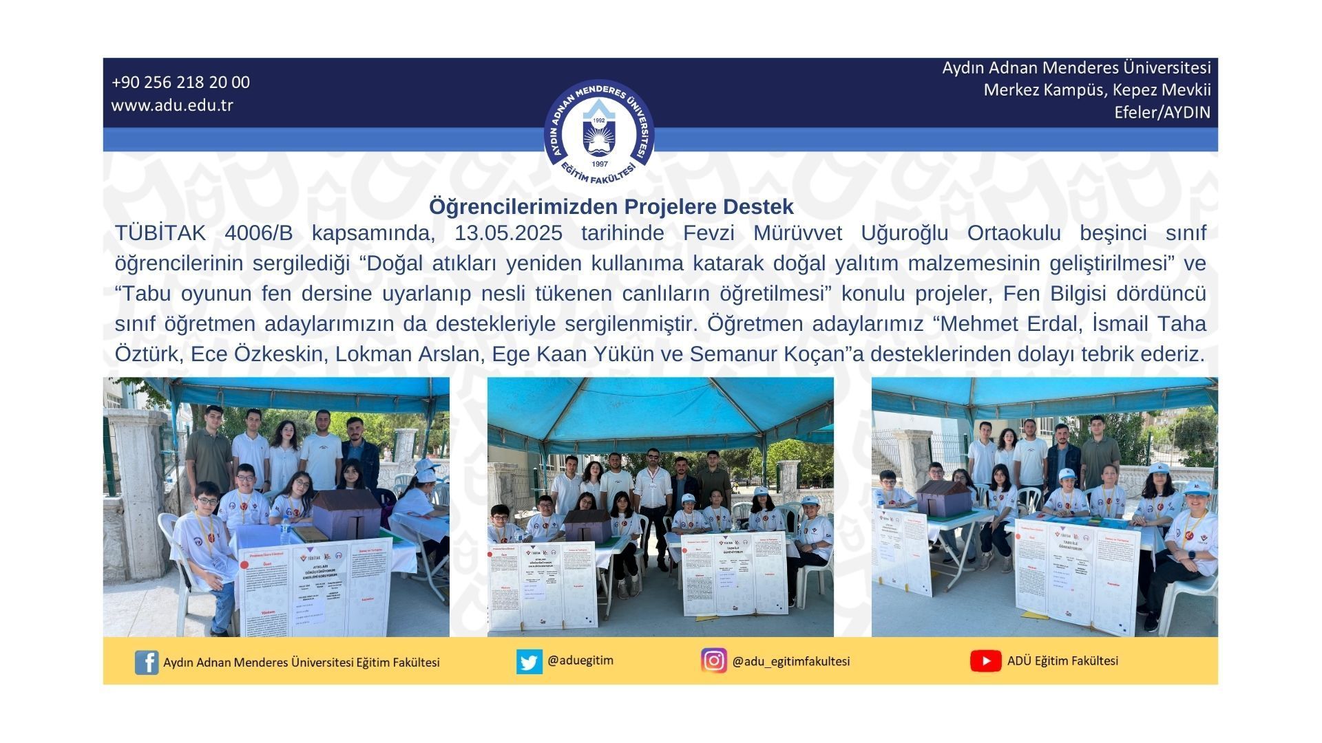 TÜBİTAK 4006/B kapsamında, 13.05.2025 tarihinde Fevzi Mürüvvet UÄŸuroÄŸlu Ortaokulu beÅŸinci sınıf öÄŸrencilerinin sergilediÄŸi “DoÄŸal atıkları yeniden kullanıma katarak doÄŸal yalıtım malzemesinin geliÅŸtirilmesi” ve “Tabu oyunun fen dersine uyarlanıp nesli tükenen canlıların öÄŸretilmesi” konulu projeler, Fen Bilgisi dördüncü sınıf öÄŸretmen adaylarımızın da destekleriyle sergilenmiÅŸtir. ÖÄŸretmen adaylarımız “Mehmet Erdal, İsmail Taha Öztürk, Ece Özkeskin, Lokman Arslan, Ege Kaan Yükün ve Semanur Koçan”a desteklerinden dolayı tebrik ederiz.