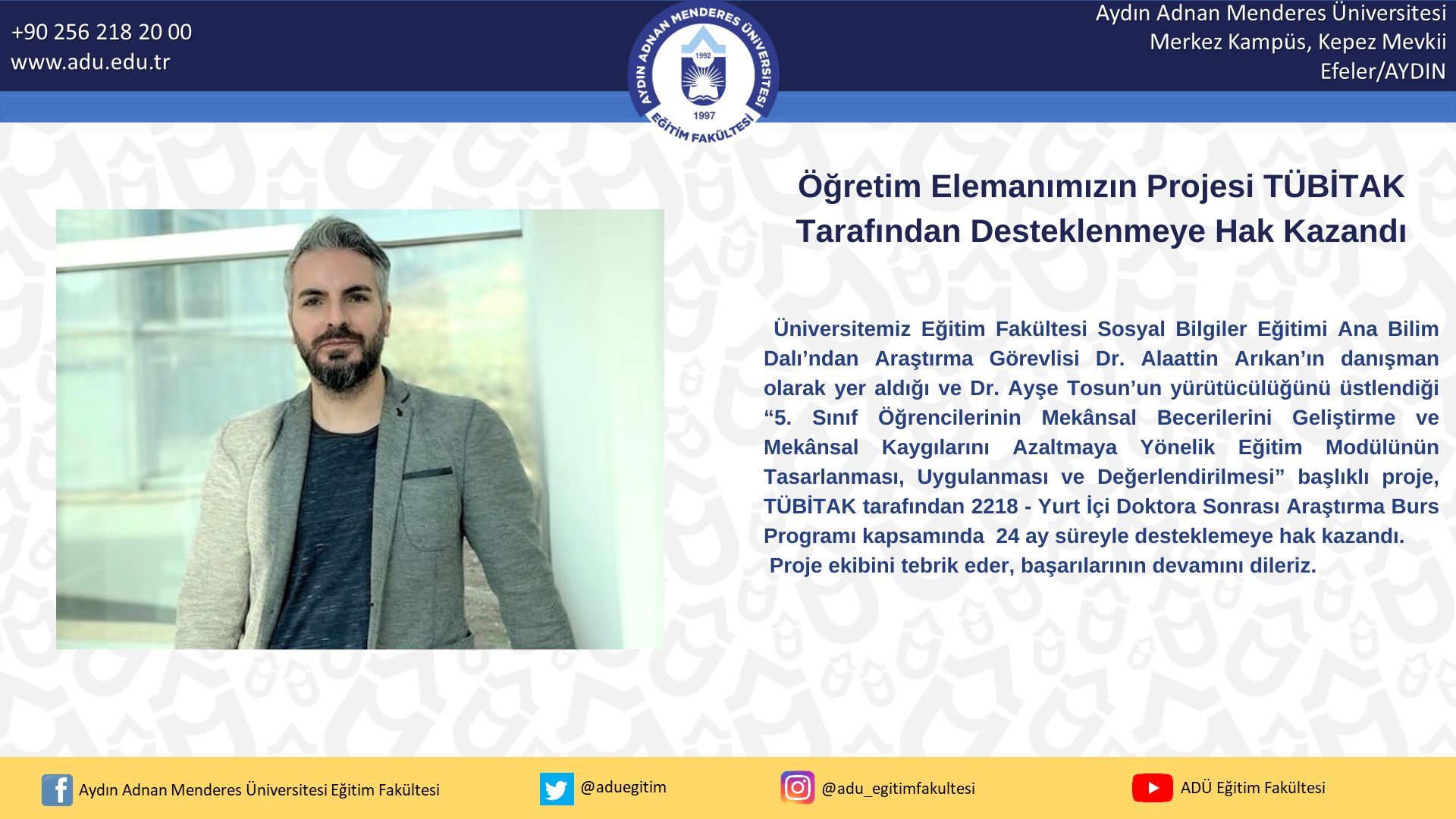Üniversitemiz Eğitim Fakültesi Sosyal Bilgiler Eğitimi Ana Bilim Dalı’ndan Araştırma Görevlisi Dr. Alaattin Arıkan’ın danışman olarak yer aldığı ve Dr. Ayşe Tosun’un yürütücülüğünü üstlendiği “5. Sınıf Öğrencilerinin Mekânsal Becerilerini Geliştirme ve Mekânsal Kaygılarını Azaltmaya Yönelik Eğitim Modülünün Tasarlanması, Uygulanması ve Değerlendirilmesi” başlıklı proje, TÜBİTAK tarafından 2218 - Yurt İçi Doktora Sonrası Araştırma Burs Programı kapsamında 24 ay süreyle desteklemeye hak kazandı. Proje ekibini tebrik eder, başarılarının devamını dileriz.