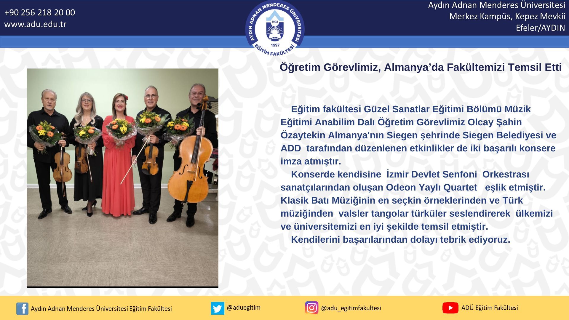 EÄŸitim fakültesi Güzel Sanatlar EÄŸitimi Bölümü Müzik EÄŸitimi Anabilim Dalı ÖÄŸretim Görevlimiz Olcay Åžahin Özaytekin Almanya'nın Siegen ÅŸehrinde Siegen Belediyesi ve ADD tarafından düzenlenen etkinlikler de iki baÅŸarılı konsere imza atmıştır. Konserde kendisine İzmir Devlet Senfoni Orkestrası sanatçılarından oluÅŸan Odeon Yaylı Quartet eÅŸlik etmiÅŸtir. Klasik Batı MüziÄŸinin en seçkin örneklerinden ve Türk müziÄŸinden valsler tangolar türküler seslendirerek ülkemizi ve üniversitemizi en iyi ÅŸekilde temsil etmiÅŸtir. Kendilerini baÅŸarılarından dolayı tebrik ediyoruz.