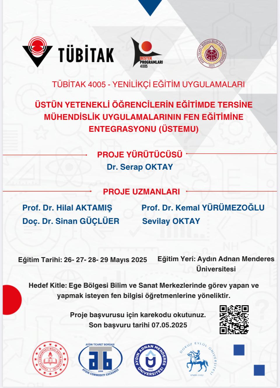 Aydın Efeler, Aydın Ticaret Borsası Bilim Sanat Merkezi Kurum Müdürü Dr. Serap OKTAY’ın yürütücülüğünü yaptığı, Aydın Adnan Menderes Üniversitesinden Prof. Dr. Hilal AKTAMIŞ ve Doç. Dr. Sinan GÜÇLÜER, Dokuz Eylül Üniversitesinden Prof. Dr. Kemal YÜRÜMEZOĞLU ve MEB’te görev yapan Eğitimci Başöğretmen Sevilay OKTAY’ın araştırmacı-uzman olarak görev aldığı proje, TÜBİTAK 4005 Bilim ve Toplum Yenilikçi Eğitim Uygulamaları Destekleme Programı kapsamında desteklenmeye layık görüldü. Ege bölgesindeki bilim sanat merkezi Fen Bilimleri öğretmenlerine yönelik hazırlanan Projeyle “Üstün Yetenekli Öğrencilerin Eğitiminde Tersine Mühendislik Uygulamalarının Fen Eğitimine Entegrasyonu” konusunda eğitimler verilecektir. Tersine mühendislik, mevcut bir sistemin veya ürünün analiz edilerek yeniden tasarlanması sürecidir ve bu yaklaşım, öğrencilere derinlemesine düşünme ve yenilikçi çözümler üretme fırsatı sunar. Üstün yetenekli öğrenciler için bu tür uygulamaların, eğitim sürecini daha etkili ve ilgi çekici hale getirerek, yenilikçi ve orijinal ürünlerin ortaya çıkmasına katkı sağlaması beklenmektedir. Bu kapsamda projede, Bilim Sanat Merkezlerinde (BİLSEM) öğrenim gören üstün yetenekli öğrencilerin fen eğitimindeki öğrenme süreçlerini zenginleştirerek, bilimsel düşünme becerilerini güçlendirmek ve onları geleceğin lider bilim insanları olarak yetiştirmeye yönelik olarak BİLSEM öğretmenlerinin yenilikçi bir yaklaşım olan tersine mühendislik uygulamalarını derslerine entegre etmelerini sağlamak amaçlanmaktadır.