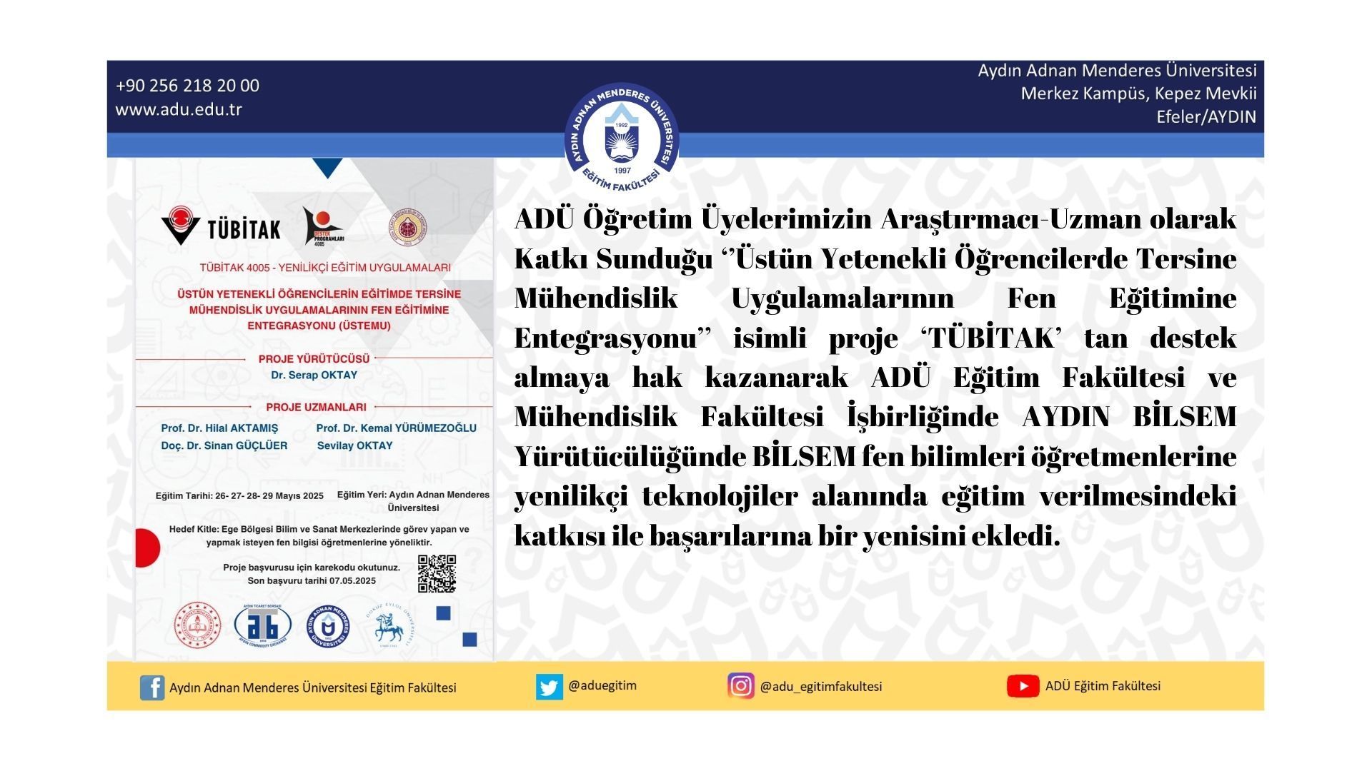 ADÜ Öğretim Üyelerimizin Araştırmacı-Uzman olarak Katkı Sunduğu ‘’Üstün Yetenekli Öğrencilerde Tersine Mühendislik Uygulamalarının Fen Eğitimine Entegrasyonu’’ isimli proje ‘TÜBİTAK’ tan destek almaya hak kazanarak ADÜ Eğitim Fakültesi ve Mühendislik Fakültesi İşbirliğinde AYDIN BİLSEM Yürütücülüğünde BİLSEM fen bilimleri öğretmenlerine yenilikçi teknolojiler alanında eğitim verilmesindeki katkısı ile başarılarına bir yenisini ekledi.