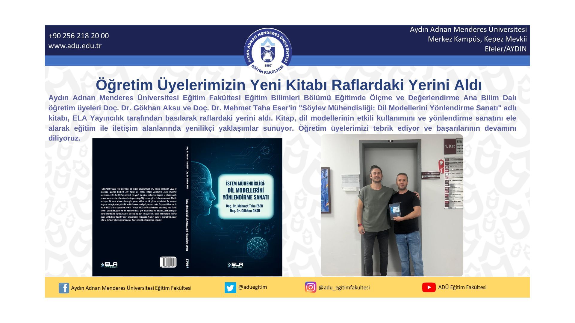 Aydın Adnan Menderes Üniversitesi EÄŸitim Fakültesi EÄŸitim Bilimleri Bölümü EÄŸitimde Ölçme ve DeÄŸerlendirme Ana Bilim Dalı öÄŸretim üyeleri Doç. Dr. Gökhan Aksu ve Doç. Dr. Mehmet Taha Eser'in "Söylev MühendisliÄŸi: Dil Modellerini Yönlendirme Sanatı" adlı kitabı, ELA Yayıncılık tarafından basılarak raflardaki yerini aldı. Kitap, dil modellerinin etkili kullanımını ve yönlendirme sanatını ele alarak eÄŸitim ile iletiÅŸim alanlarında yenilikçi yaklaşımlar sunuyor. ÖÄŸretim üyelerimizi tebrik ediyor ve baÅŸarılarının devamını diliyoruz.