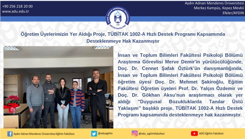 İnsan ve Toplum Bilimleri Fakültesi Psikoloji Bölümü AraÅŸtırma Görevlisi Merve Demir’in yürütücülüÄŸünde, Doç. Dr. Cennet Åžafak Öztürk’ün danışmanlığında, İnsan ve Toplum Bilimleri Fakültesi Psikoloji Bölümü öÄŸretim üyesi Doç. Dr. Mehmet ÅžakiroÄŸlu, EÄŸitim Fakültesi ÖÄŸretim üyeleri Prof. Dr. Yalçın Özdemir ve Doç. Dr. Gökhan Aksu'nun araÅŸtırmacı olarak yer aldığı “Duygusal Bozukluklarda Tanılar Üstü Yaklaşım” baÅŸlıklı proje, TÜBİTAK 1002-A Hızlı Destek Programı kapsamında desteklenmeye hak kazanmıştır.