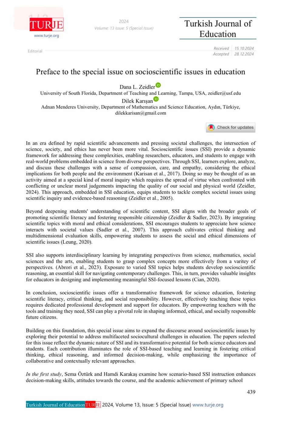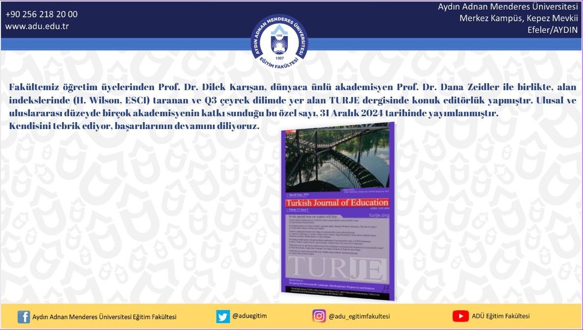 Fakültemiz öÄŸretim üyelerinden Prof. Dr. Dilek Karışan, dünyaca ünlü akademisyen Prof. Dr. Dana Zeidler ile birlikte, alan indekslerinde (H. Wilson, ESCI) taranan ve Q3 çeyrek dilimde yer alan TURJE dergisinde konuk editörlük yapmıştır. Ulusal ve uluslararası düzeyde birçok akademisyenin katkı sunduÄŸu bu özel sayı, 31 Aralık 2024 tarihinde yayımlanmıştır.