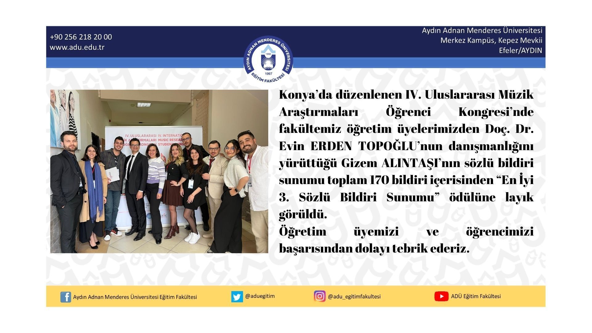 Kongre sonunda Doç. Dr. Evin Erden Topoğlu’nun danışmanlığını yürüttüğü Gizem ALINTAŞI’nın sözlü bildiri sunumu toplam 170 bildiri içerisinden “En İyi 3. Sözlü Bildiri Sunumu” ödülüne layık görüldü.