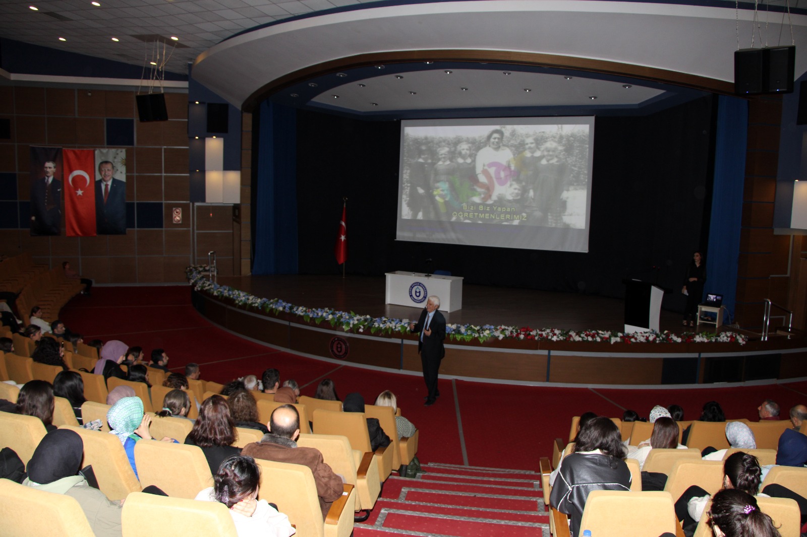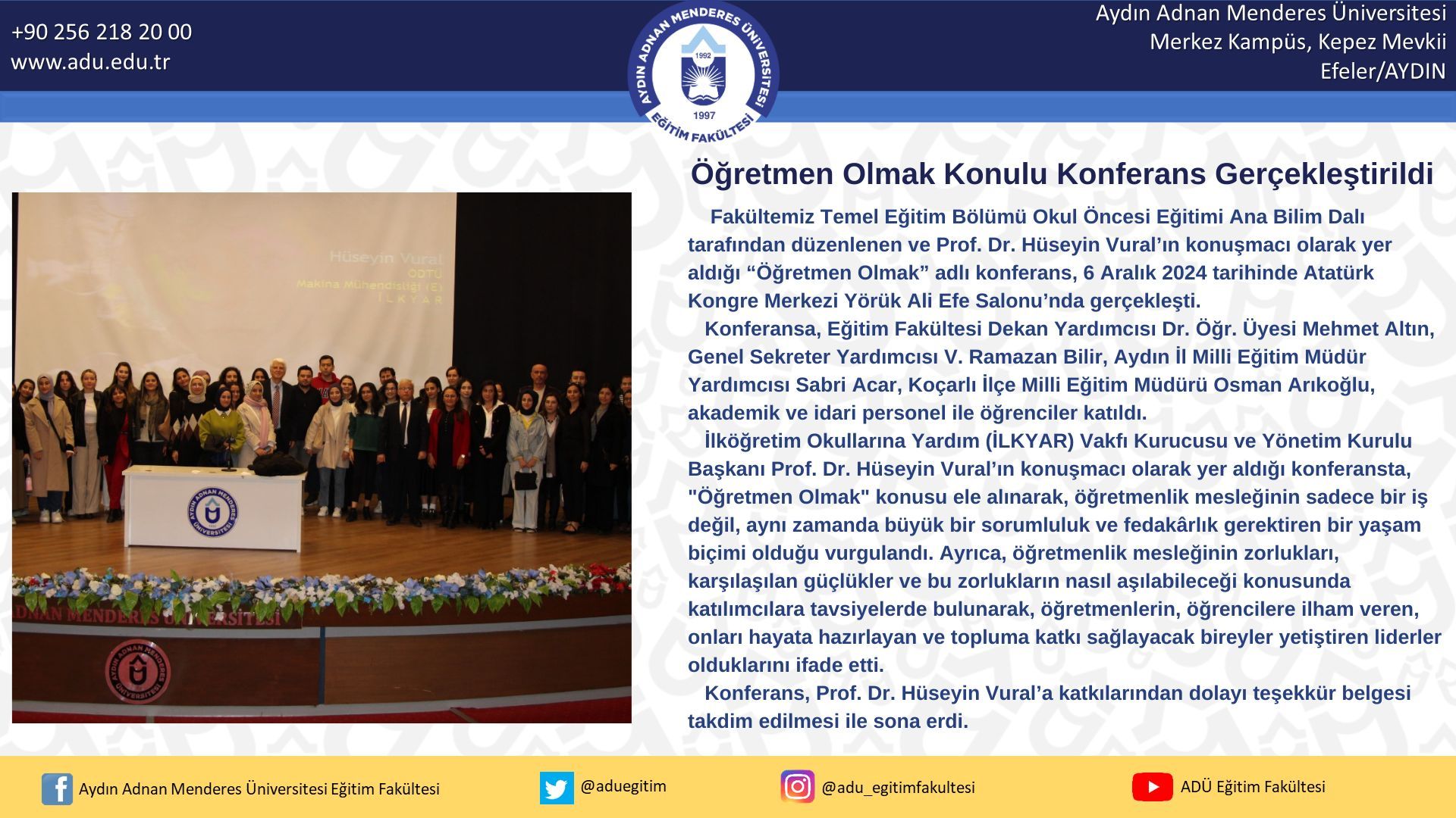 Fakültemiz Temel EÄŸitim Bölümü Okul Öncesi EÄŸitimi Ana Bilim Dalı tarafından düzenlenen ve Prof. Dr. Hüseyin Vural’ın konuÅŸmacı olarak yer aldığı “ÖÄŸretmen Olmak” adlı konferans, 6 Aralık 2024 tarihinde Atatürk Kongre Merkezi Yörük Ali Efe Salonu’nda gerçekleÅŸti. Konferansa, EÄŸitim Fakültesi Dekan Yardımcısı Doç. Dr. Mehmet Altın, Genel Sekreter Yardımcısı V. Ramazan Bilir, Aydın İl Milli EÄŸitim Müdür Yardımcısı Sabri Acar, Koçarlı İlçe Milli EÄŸitim Müdürü Osman ArıkoÄŸlu, akademik ve idari personel ile öÄŸrenciler katıldı. İlköÄŸretim Okullarına Yardım (İLKYAR) Vakfı Kurucusu ve Yönetim Kurulu BaÅŸkanı Prof. Dr. Hüseyin Vural’ın konuÅŸmacı olarak yer aldığı konferansta, "ÖÄŸretmen Olmak" konusu ele alınarak, öÄŸretmenlik mesleÄŸinin sadece bir iÅŸ deÄŸil, aynı zamanda büyük bir sorumluluk ve fedakârlık gerektiren bir yaÅŸam biçimi olduÄŸu vurgulandı. Ayrıca, öÄŸretmenlik mesleÄŸinin zorlukları, karşılaşılan güçlükler ve bu zorlukların nasıl aşılabileceÄŸi konusunda katılımcılara tavsiyelerde bulunarak, öÄŸretmenlerin, öÄŸrencilere ilham veren, onları hayata hazırlayan ve topluma katkı saÄŸlayacak bireyler yetiÅŸtiren liderler olduklarını ifade etti. Konferans, Prof. Dr. Hüseyin Vural’a katkılarından dolayı teÅŸekkür belgesi takdim edilmesi ile sona erdi.
