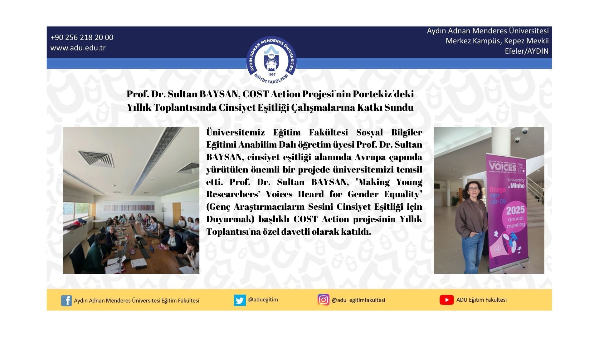 Üniversitemiz Eğitim Fakültesi Sosyal Bilgiler Eğitimi Anabilim Dalı öğretim üyesi Prof. Dr. Sultan Baysan, cinsiyet eşitliği alanında Avrupa çapında yürütülen önemli bir projede üniversitemizi temsil etti. Prof. Dr. Sultan BAYSAN, "Making Young Researchers’ Voices Heard for Gender Equality" (Genç Araştırmacıların Sesini Cinsiyet Eşitliği İçin Duyurmak) başlıklı COST Action projesinin Yıllık Toplantısı'na özel davetli olarak katıldı.