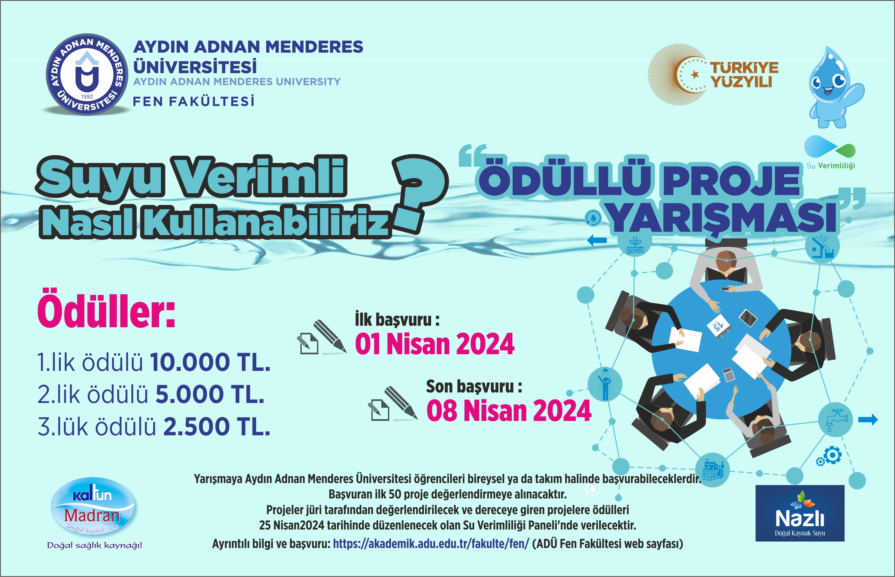 Bu nedenle ADÜ Fen Fakültesi olarak hem su verimliliği konusunda farkındalık yaratmak hem de bu sorunlara çözüm aramak için ödüllü proje yarışması düzenliyoruz. Umarız ADÜ ailesi olarak Su Verimliliği Seferberliğine katkı sunabiliriz.