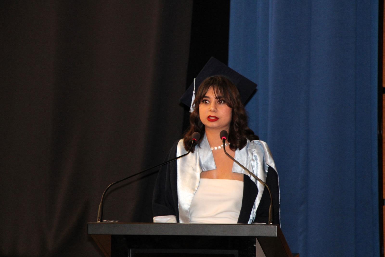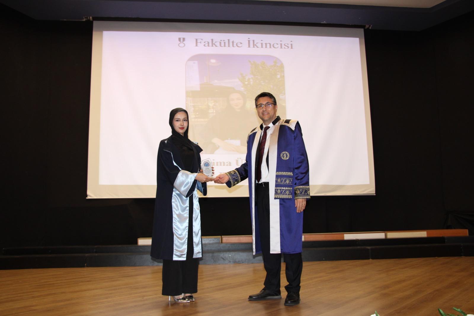 Üniversitemiz Rektör Yardımcısı Prof. Dr. Erkan Salan, 2024-2025 Akademik yılı fakülte birincisi Gülselin Çam’ı tebrik ederek plaket ve hediye takdiminde bulundu. Ödüllerinin verilmesinin ardından konuşma yapan fakülte birincisi Gülselin Çam, emeklerinden dolayı tüm öğretim elemanlarına ve ailelere kendisi ve arkadaşları adına teşekkürlerini iletti.