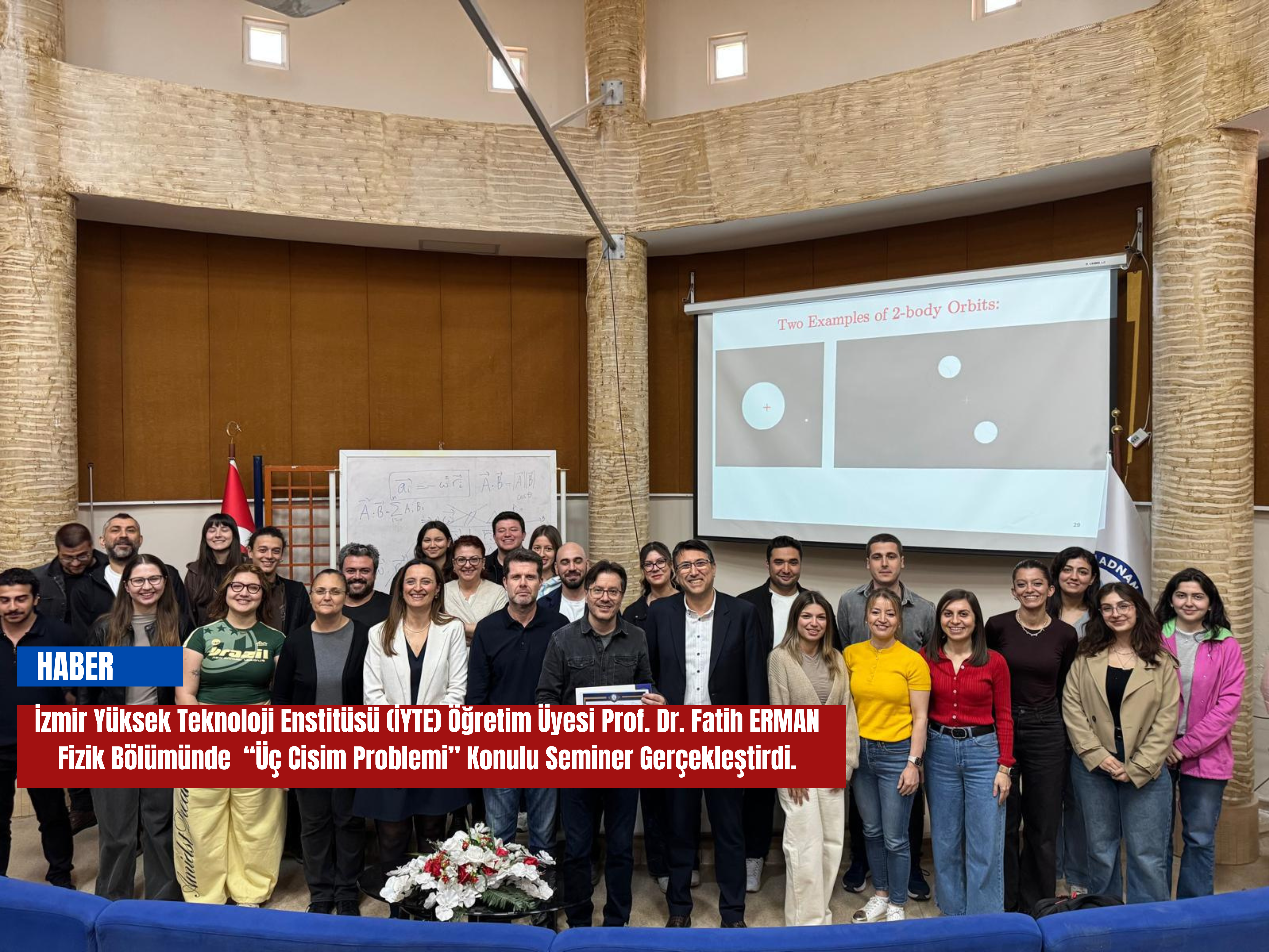 Fizik Bölümü Seminerleri kapsamında 10 Nisan 2026 Cuma günü İzmir Yüksek Teknoloji Enstitüsü (İYTE) Öğretim Üyesi Prof. Dr. Fatih ERMAN hocamızı ağırladık. Hocamız fizikte üç cisim problemi olarak bilinen kütle çekim kuvvetlerinin çözümleri konusunda seminer verdi. Güneş Dünya Ay gibi cisimler üzerinden de örneklendirilen konuşma oldukça ilgi çekmiş ve hocamıza bir çok soru yöneltilmiştir. Konuşma sonrası teşekkür belgesini Dekanımız Prof. Dr. Aytaç Gürhan GÖKÇE takdim etti. Hocamıza ve tüm katılımcılarımıza teşekkür ederiz.