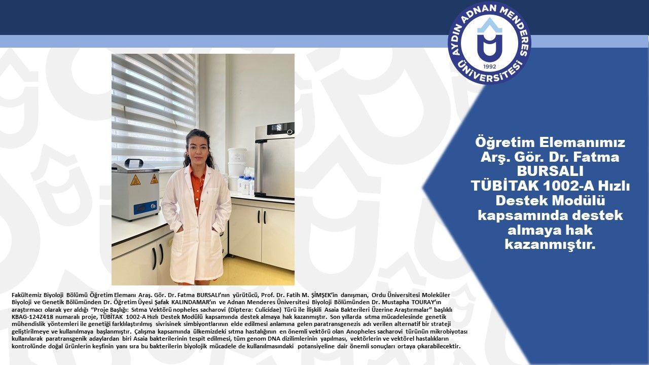 Fakültemiz Biyoloji Bölümü Öğretim Elemanı Arş. Gör. Dr. Fatma BURSALI’nın yürütücü, Prof. Dr. Fatih M. ŞİMŞEK’in danışman, Ordu Üniversitesi Moleküler Biyoloji ve Genetik Bölümünden Dr. Öğretim Üyesi Şafak KALINDAMAR’ın ve Adnan Menderes Üniversitesi Biyoloji Bölümünden Dr. Mustapha TOURAY’ın araştırmacı olarak yer aldığı “Proje Başlığı: Sıtma Vektörü Anopheles sacharovi (Diptera: Culicidae) Türü ile İlişkili Asaia Bakterileri Üzerine Araştırmalar” başlıklı KBAG-124Z418 numaralı proje, TÜBİTAK 1002-A Hızlı Destek Modülü kapsamında destek almaya hak kazanmıştır.