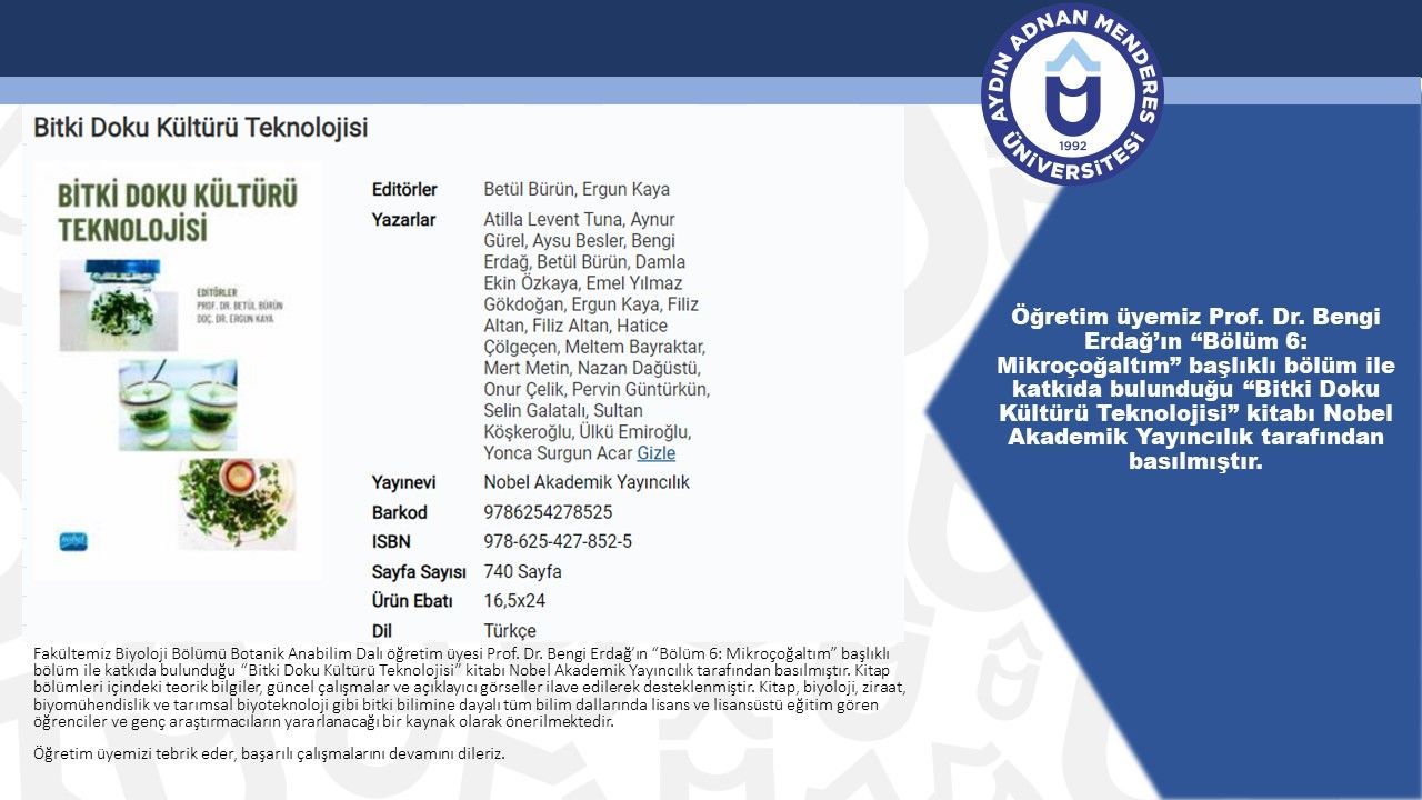 Fakültemiz Biyoloji Bölümü Botanik Anabilim Dalı öğretim üyesi Prof. Dr. Bengi Erdağ’ın “Bölüm 6: Mikroçoğaltım” başlıklı bölüm ile katkıda bulunduğu “Bitki Doku Kültürü Teknolojisi” kitabı Nobel Akademik Yayıncılık tarafından basılmıştır. Kitap bölümleri içindeki teorik bilgiler, güncel çalışmalar ve açıklayıcı görseller ilave edilerek desteklenmiştir. Kitap, biyoloji, ziraat, biyomühendislik ve tarımsal biyoteknoloji gibi bitki bilimine dayalı tüm bilim dallarında lisans ve lisansüstü eğitim gören öğrenciler ve genç araştırmacıların yararlanacağı bir kaynak olarak önerilmektedir.