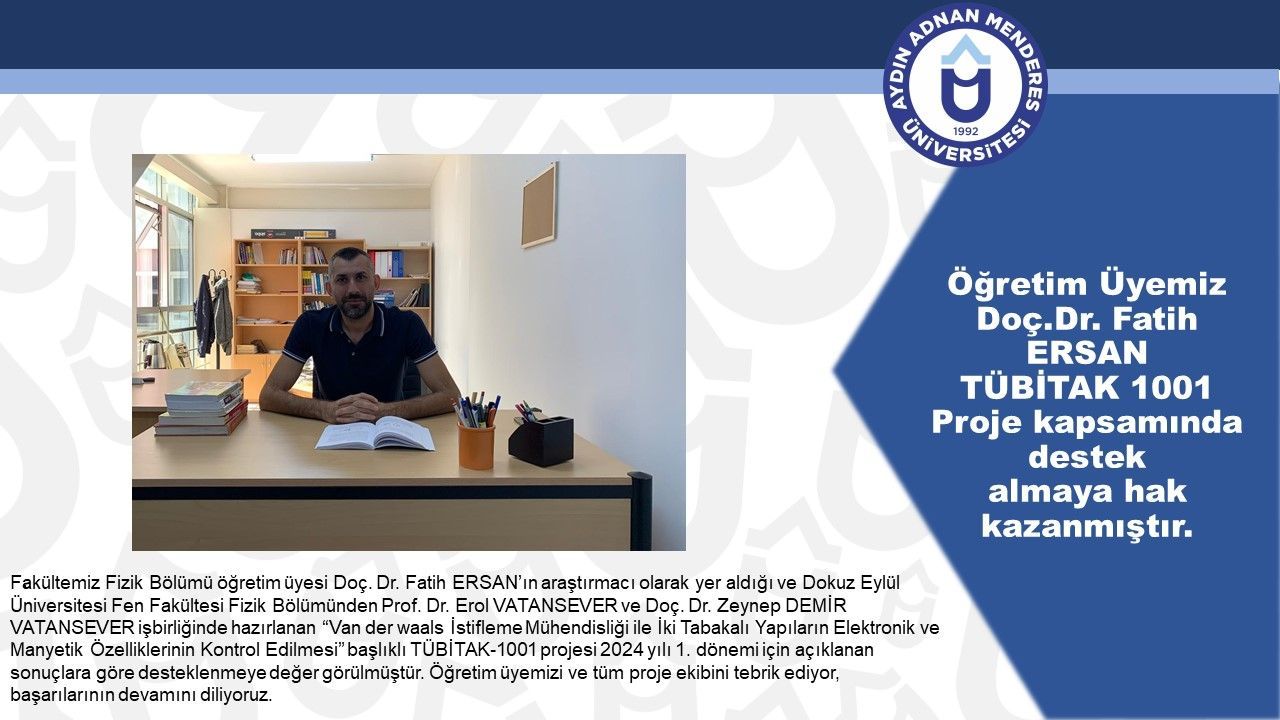 Fakültemiz Fizik Bölümü öÄŸretim üyesi Doç. Dr. Fatih ERSAN’ın araÅŸtırmacı olarak yer aldığı ve Dokuz Eylül Üniversitesi Fen Fakültesi Fizik Bölümünden Prof. Dr. Erol VATANSEVER ve Doç. Dr. Zeynep DEMİR VATANSEVER iÅŸbirliÄŸinde hazırlanan “Van der waals İstifleme MühendisliÄŸi ile İki Tabakalı Yapıların Elektronik ve Manyetik Özelliklerinin Kontrol Edilmesi” baÅŸlıklı TÜBİTAK-1001 projesi 2024 yılı 1. dönemi için açıklanan sonuçlara göre desteklenmeye deÄŸer görülmüÅŸtür. ÖÄŸretim üyemizi ve tüm proje ekibini tebrik ediyor, baÅŸarılarının devamını diliyoruz.