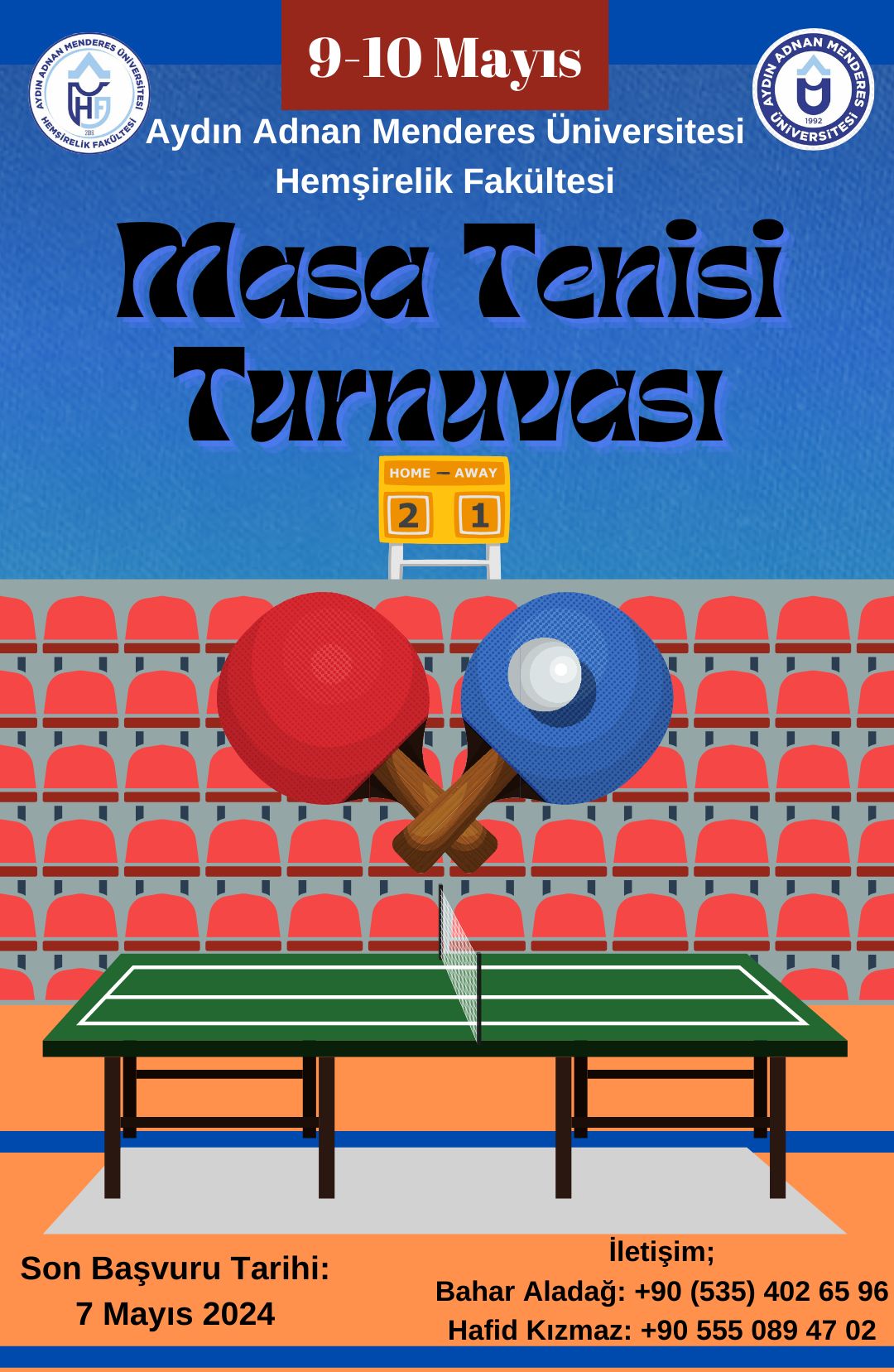 Fakültemizde 9-10 Mayıs 2024 tarihlerinde masa tenisi turnuvası yapılacaktır. Turnuvaya katılmak isteyen öğrencilerimiz fakültemiz 2. sınıf temsilcileri Bahar Aladağ (Tel: 05354026596) ve Hafid Kızmaz (05550894702)'a ulaşabilirler. karşılaşmalar fakülte binası bodrum katta yapılacaktır.