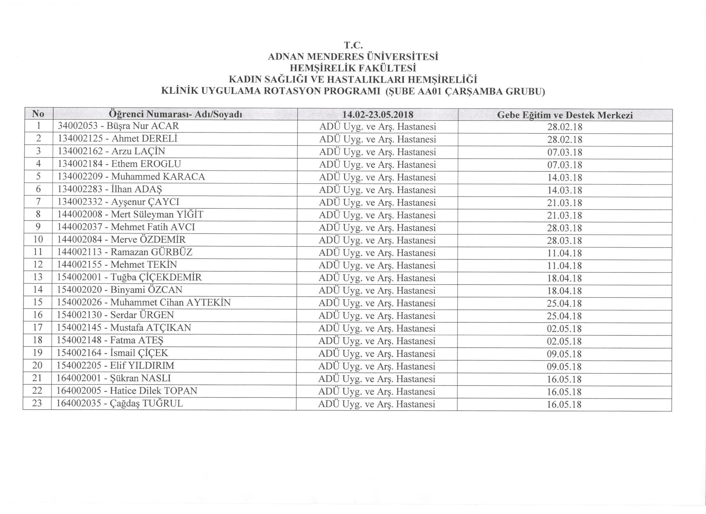 Kadın Sağlığı ve Hastalıkları Hemşireliği Uygulama Rotasyonu Çarşamba Grubu