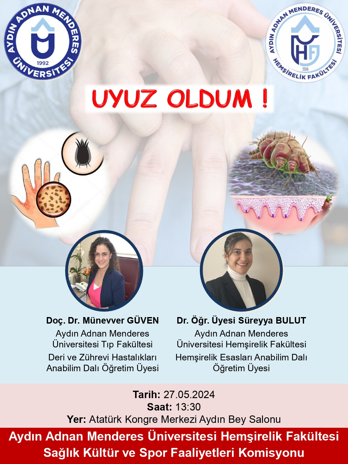 27 Mayıs 2024 tarihinde 13:30’da Hemşirelik Fakültesi Sağlık Kültür Spor Faaliyetleri Komisyonu tarafından ‘Uyuz Oldum!” semineri gerçekleştirilecektir.Tüm öğrencilerimiz ile akademik ve idari personelimiz davetlidir.