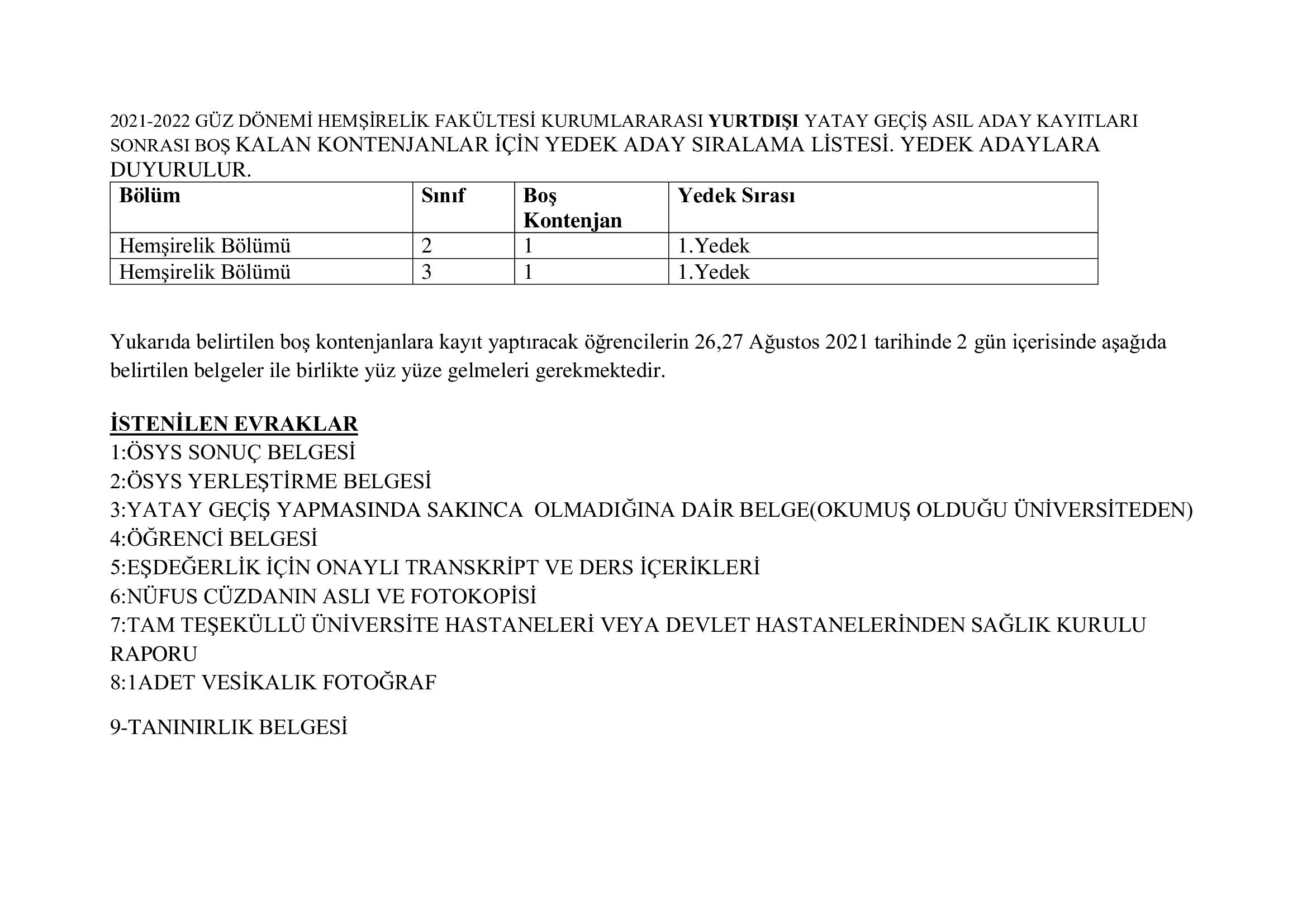 YURT DIŞI YATAY GEÇİŞ BOŞ KALAN KONTENJANLAR İÇİN KAYIT HAKKI KAZANAN YEDEK LİSTESİ