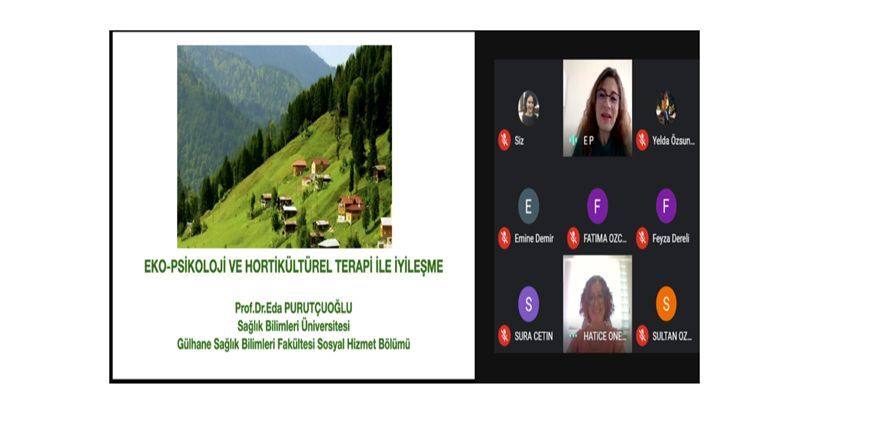 Hemşirelik Fakültesinin bilimsel etkinlikleri kapsamında, Prof. Dr. Eda Purutçuoğlu’nun “Ekopsikoloji ve Hortikültürel Treapi ile İyileşme” isimli konferansı 2 Haziran 2021 tarihinde saat 12.30-13.30 arasında Google meet üzerinden çevrim içi olarak gerçekleşti. Moderatörlüğünü Dekan yardımcısı Dr. Öğr.Üyesi Hatice Öner’in yaptığı konferansa, Hemşirelik Fakültesi Dekanı Prof. Dr. Yelda Özsunar, Dekan Yardımcısı Doç. Dr. Belgin Yıldırım, fakülte öğretim elemanları ve öğrencileri katıldı. Prof. Dr. Eda Purutçuoğlu sunumunda, İnsanlığın doğa ve çevre ile kurduğu iletişim vazgeçilmez olduğunu, insanların bedensel, ruhsal, bilişsel ve sosyal iyilik hallerinin yaşadıkları çevre ile doğrudan ilişkili olduğunu vurgulamıştır. Sunumda ruhsal olarak doğaya yakınlaştırarak, psikolojik olarak iyileşmede terapötik bir teknik olan ekopsikoloji ve doğayla tedavi yöntemi olarak tanımlanan hortikültürel terapi kavramları hakkında bilgiler vermiştir. Sunum sonunda katılımcıların soruları ve görüşleri ile konferans sonlandırıldı. Öğretim elemanları ve öğrencilerimize sunumu ile verdiği değerli katkıları için Prof. Dr. Eda Purutçuoğlu’na teşekkür belgesi verildi.