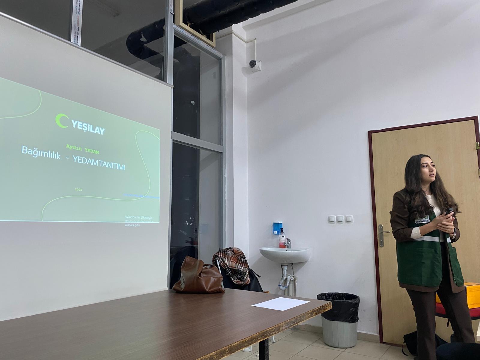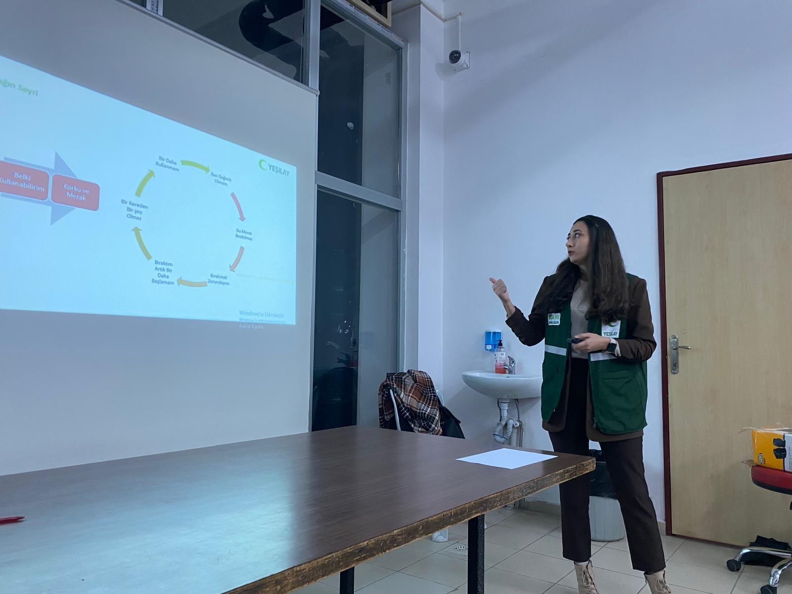 EtkinliÄŸin açılış konuÅŸmasını HemÅŸirelik Fakültesi Bağımlılıkla Mücadele Çalışmaları Ekibi üyesi Dr. ÖÄŸr. Üyesi Süleyman Ümit ÅžENOCAK gerçekleÅŸtirdi. Ardından, etkinlikte konuÅŸmacı olarak yer alan Sosyal Hizmet Uzmanı Elvan AKÇİL FİDAN “YeÅŸilay ve YeÅŸilay Danışmanlık Merkezi’nin (YEDAM) Tanıtımı”nın yer aldığı sunumunu katılımcılar ile paylaÅŸtı ve YeÅŸilay’ın sunmuÅŸ olduÄŸu hizmetler hakkında bilgi verdi.