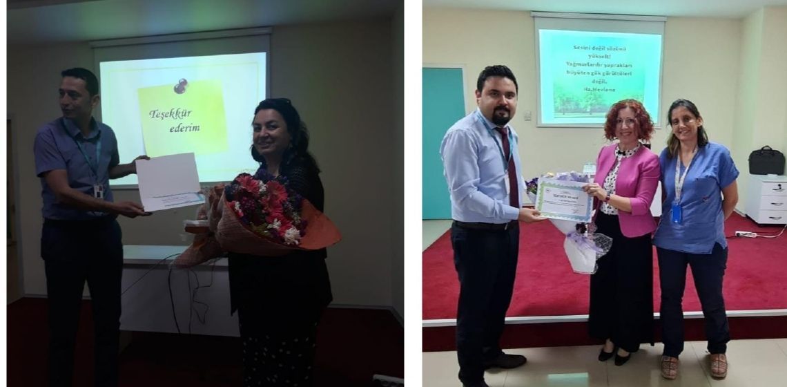 Aydın İl SaÄŸlık MüdürlüÄŸü tarafından organize edilen ve Fakültemiz Ruh SaÄŸlığı ve Hastalıkları HemÅŸireliÄŸi Anabilim Dalı ÖÄŸretim Üyeleri Dr. ÖÄŸr.Üyesi Hatice ÖNER ve Dr. ÖÄŸr.Üyesi Mehtap KIZILKAYA “İletiÅŸim YolculuÄŸu ve SaÄŸlıklı İletiÅŸim Becerileri” konulu hizmet içi eÄŸitimi 25 Mayıs ve 3 Haziran 2022 tarihlerinde olmak üzere iki grup halinde Ağız DiÅŸ SaÄŸlığı Merkezinde çalışan destek personeline vermiÅŸlerdir. EÄŸitime katılan personel, iÅŸ ev sosyal yaÅŸamlarında yaÅŸadıkları iletiÅŸim sorunlarını paylaÅŸmışlardır. Çalışanların aktif olarak katıldığı etkinlikte iletiÅŸim ve profesyonel iliÅŸkiler konuları kapsamlı olarak konuÅŸulmuÅŸtur. Hastane yönetimi ve çalışanlar benzer eÄŸitimlerin yinelenmesi önerilerini sunmuÅŸlardır. EÄŸitim sonunda eÄŸiticilere BaÅŸhekim Dt. Bahadır Turgut ve Tıbbi Hizmetler Birim sorumlusu Dt. Ömer YILDIZ tarafından teÅŸekkür belgeleri ve çiçekleri verilmiÅŸtir. Fakültemiz ile Dış paydaÅŸ kurumlarla olan hizmet içi eÄŸitim planlamalarımız devam edecektir.