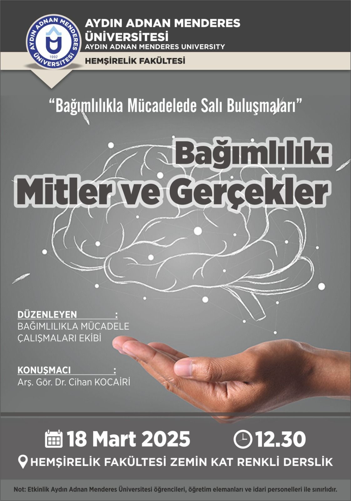 "Bağımlılıkla Mücadele Salı Buluşmaları" kapsamında, 18 Mart 2025 günü saat 12:30'da Fakültemiz binasında bulunan renkli sınıfta Arş. Gör. Dr. Cihan KOCAİRİ'nin sunumuyla gerçekleşecek olan "Bağımlılık: Mitler ve Gerçekler" konulu etkinliğe katılımlarınızı bekleriz.