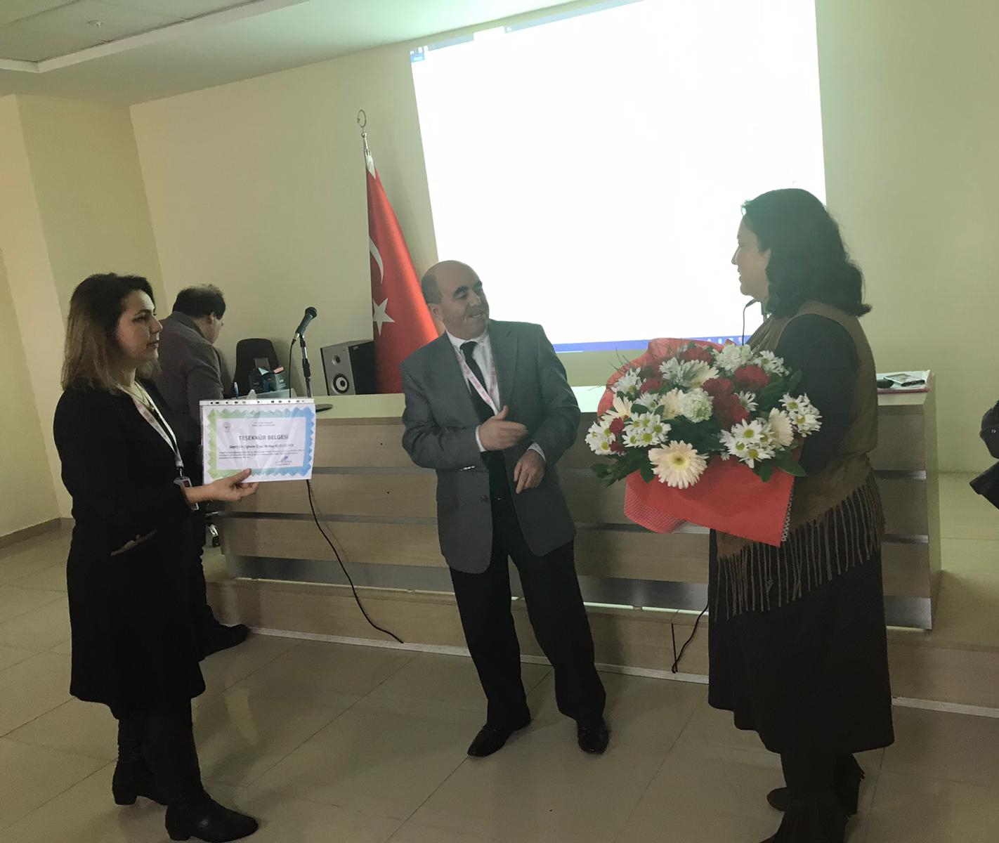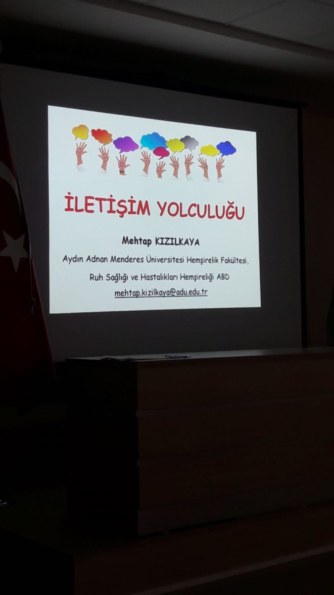 Hemşirelik Fakültesi Ruh Sağlığı ve Hastalıkları Hemşireliği Anabilim Dalı Öğretim Üyesi, Mehtap KIZILKAYA Aydın İl Sağlık Müdürlüğü toplantı salonunda Şubat ayı boyunca (7,14,21,28 Şubat 2020) 10.00-16.00 saatleri arasında Aydın İl Sağlık Müdürlüğü’ne bağlı tüm ilçelerdeki sağlık kurum ve tesislerinde çalışan sağlık personeline yönelik Kişilerarası İlişkiler, İletişim ve Öfke - Stres Yönetimi” konulu seminer verdi. Dört hafta süren seminerde toplam 400 sağlık çalışanına ulaşıldı. Seminer sonunda karşılıklı olumlu geri bildirimlerin verilmesinin ardından öğretim üyemize plaket, teşekkür belgesi ve çiçek takdim edildi.