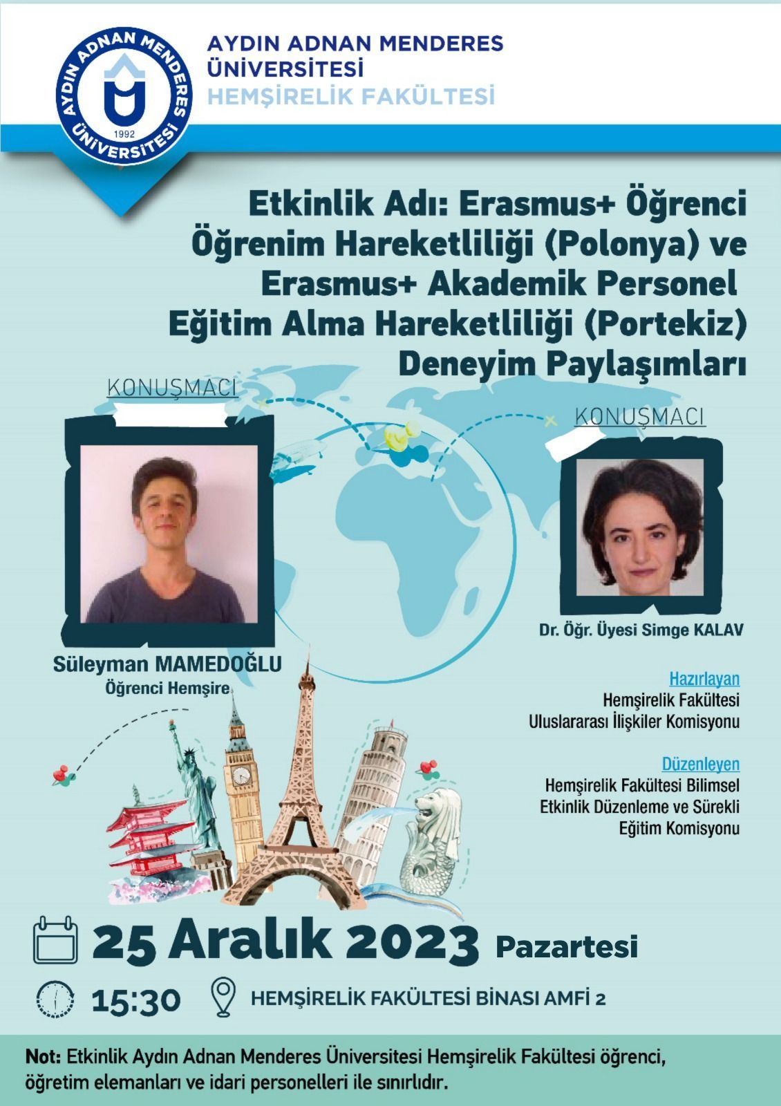 Erasmus+Öğrenci Öğrenim Hareketliliği (Polonya) ve Erasmus+Akademik Personel Eğitim Alma Hareketliliği (Portekiz) Deneyim Paylaşımları Etkinliği afişi ektedir.