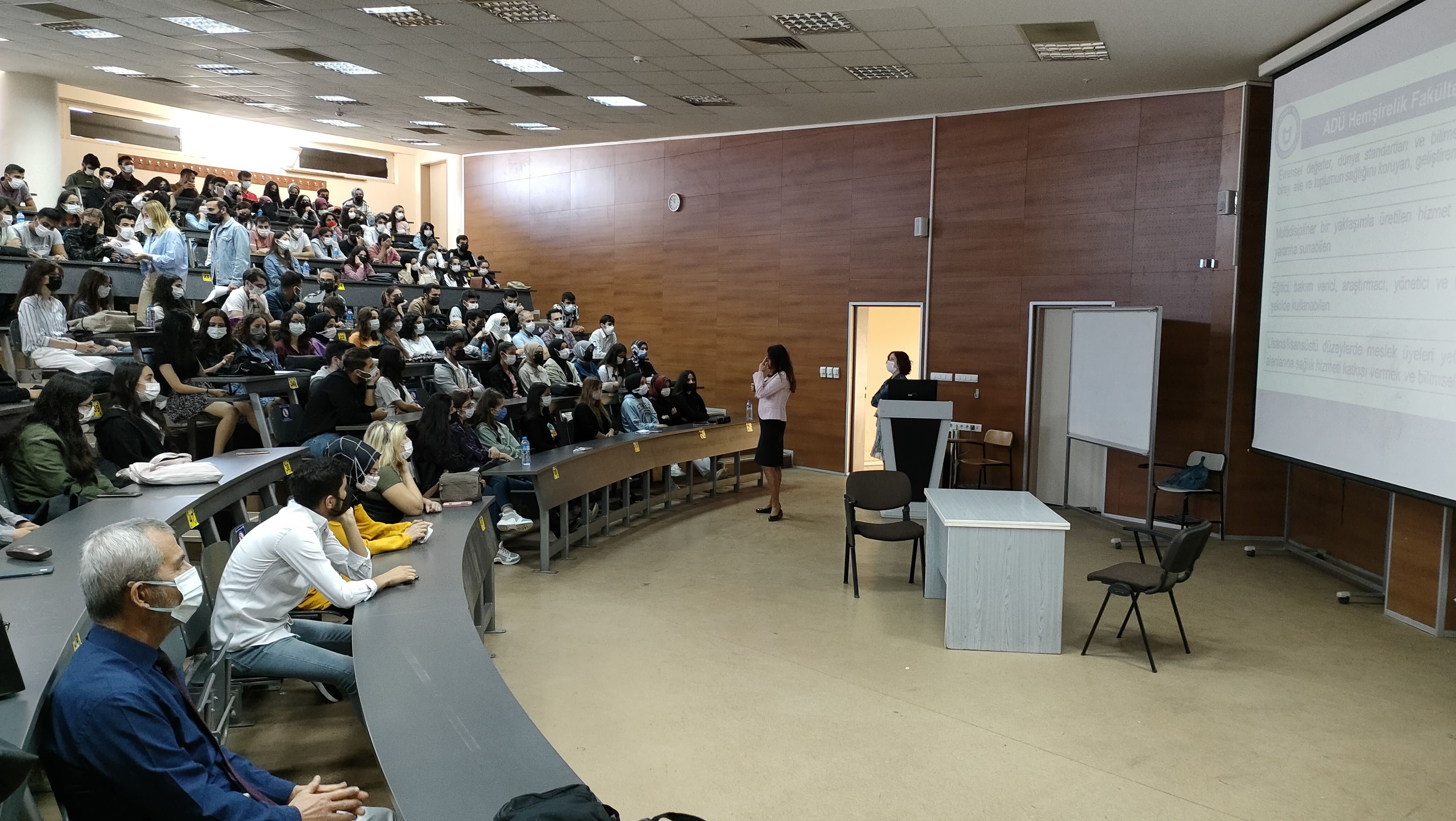 Oryantasyon eÄŸitimine Fakültemiz dekanı Prof.Dr. Yelda Özsunar “İnsan Sevgisi ve HemÅŸirelik” baÅŸlıklı konuÅŸması ile sevginin evrenselliÄŸine vurgu yaparak özellikle insana doÄŸrudan bireye hizmet veren profesyoneller için çok önemli olduÄŸunu, insan sevgisi olmayan bir hemÅŸirenin mesleÄŸinde hem mutsuz hem de verimsiz olacağını belirtti. Dekanımız sunumunda ayrıca HemÅŸirelik Fakültesinin genel misyon ve vizyon ve hedefleri ile ilgili tanıtıcı bilgiler sundu. Dekanın konuÅŸmasının arkasından eÄŸitim öÄŸretimden sorumlu dekan yardımcısı Doç.Dr. Belgin Yıldırım Üniversitemizi ve HemÅŸirelik Fakültesini tanıtan sunumunu yaptı. Dekan yardımcısı Belgin Yıldırım sunumunda, HemÅŸirelik Fakültesi eÄŸitim öÄŸretim süreci ve akademik ve idari personeli tanıtan genel bilgiler aktardı. Oryantasyon eÄŸitimi öÄŸrencilerin soru ve cevaplarıyla son buldu.